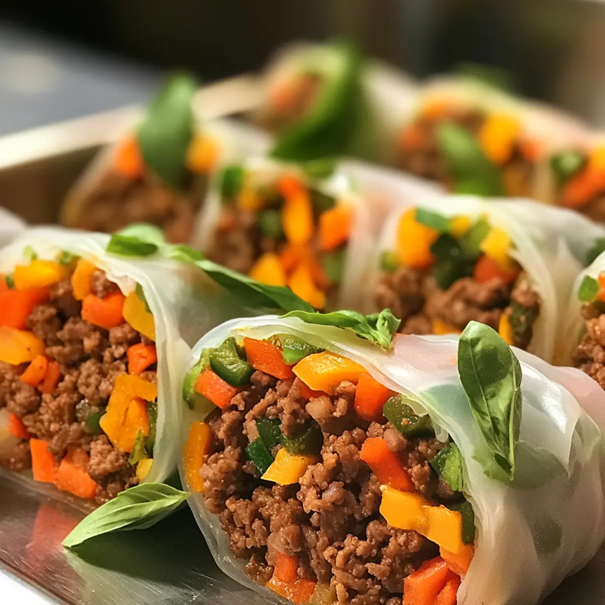 - Meeresfrüchte: Ersetze das Rinderhackfleisch durch Garnelen für eine leckere Variante mit Meeresfrüchten. Fülle die Rollen mit einer Mischung aus aromatischem Basilikum und zarten Garnelen!