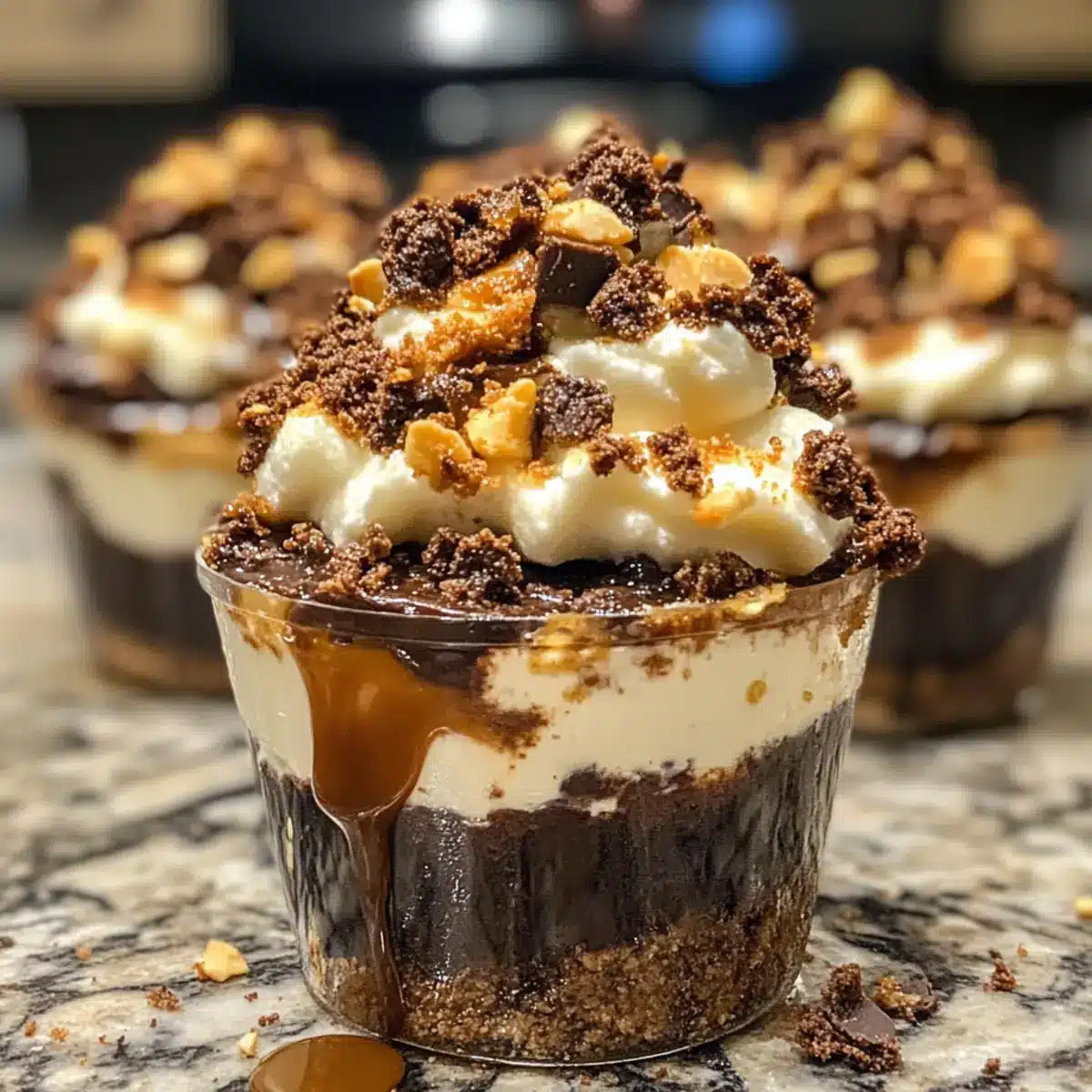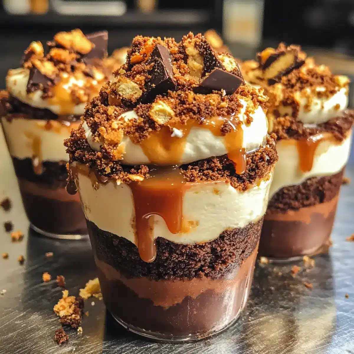 Bestreue die Becher mit den extra Browniekrümeln für eine ansprechende Textur. Danach kannst du nach Belieben noch mehr Ganache und Karamell darüber träufeln. Optional kannst du auch geschlagene Sahne oder Schokoladenspäne hinzufügen, um deiner Kreation den letzten Schliff zu geben.