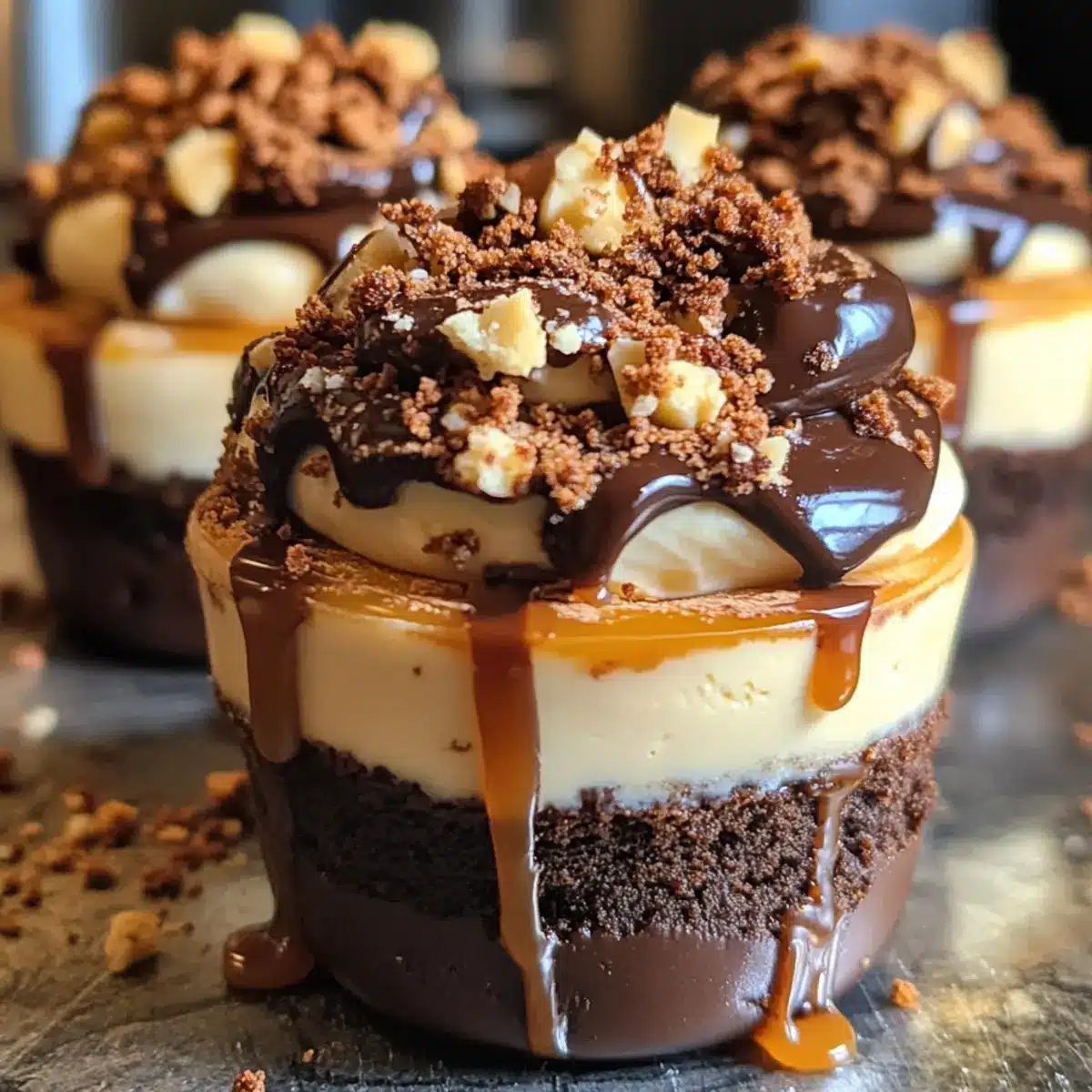 Bereite die Schokoladenganache vor, indem du geschmolzene Schokolade mit Sahne vermischst, bis sie schön glänzend ist. Träufle dann die Ganache über die Käsekuchenfüllung in jedem Becher. Anschließend folgt ein Drizzle der Karamellsauce, um den Geschmack zu intensivieren und den optischen Reiz zu erhöhen.
