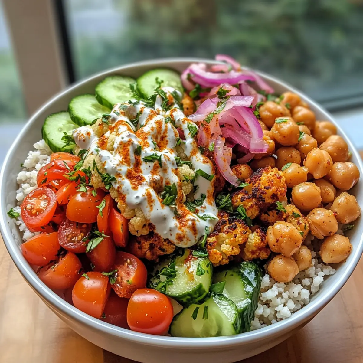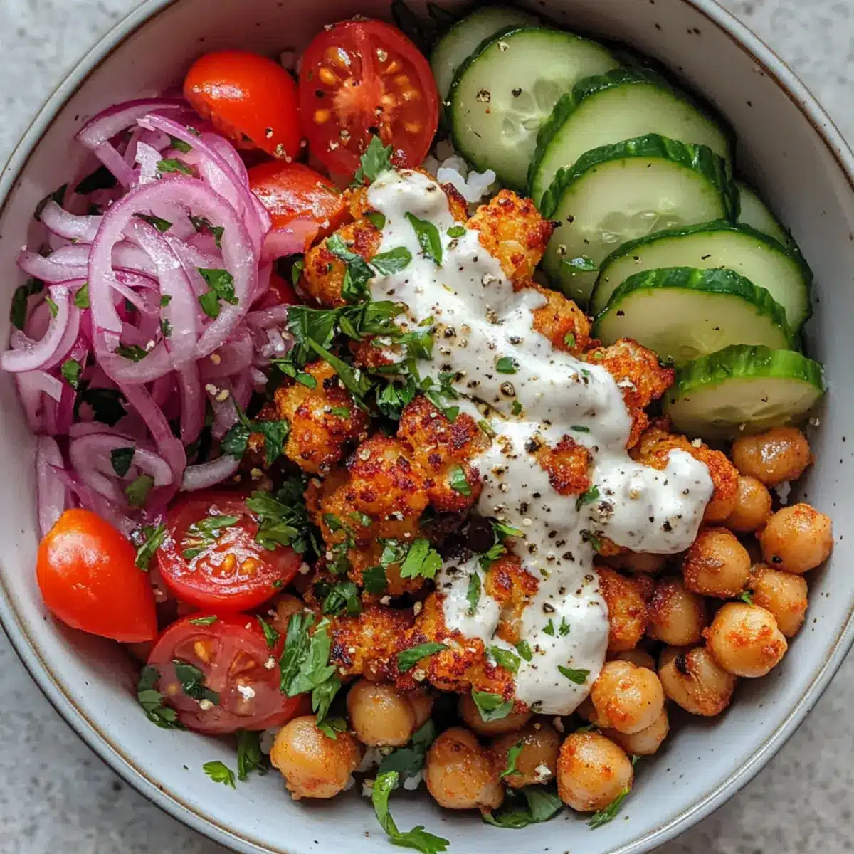 Nehmen Sie eine große Schüssel und schichten Sie zuerst den Couscous als Basis. Fügen Sie dann die knusprig gerösteten Blumenkohlstücke und Kichererbsen hinzu. Garnieren Sie die Schüssel mit gewürfeltem Gurke, halbierten Kirschtomaten und eingelegten roten Zwiebeln für eine frische Note.