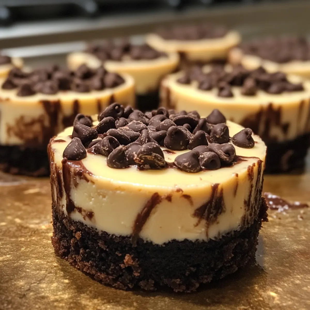 - Träufle den Schokoladenguss über die Käsekuchen und streue die Mini-Schokoladenstückchen darauf.