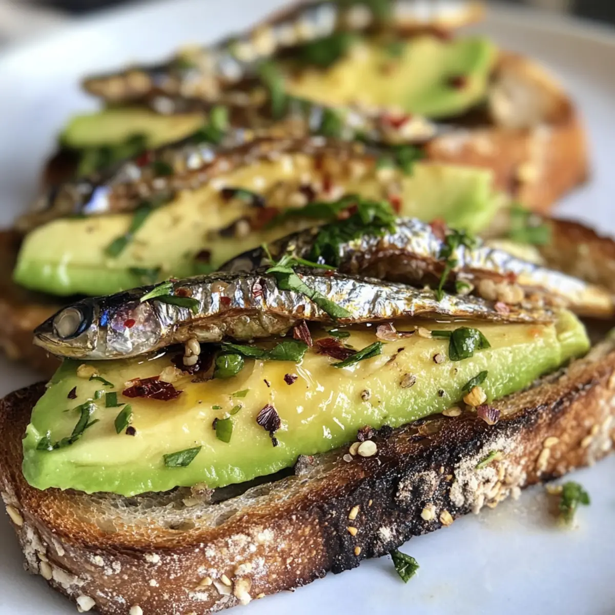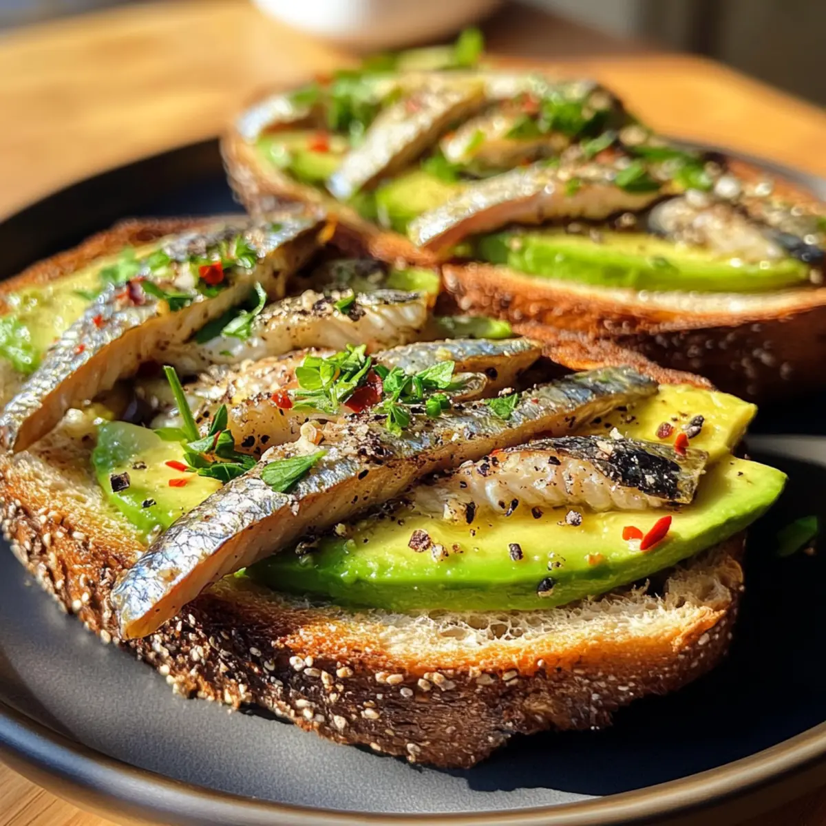 - Lege die Avocadoscheiben auf den Toast und platziere die marinierten Sardinen darauf.