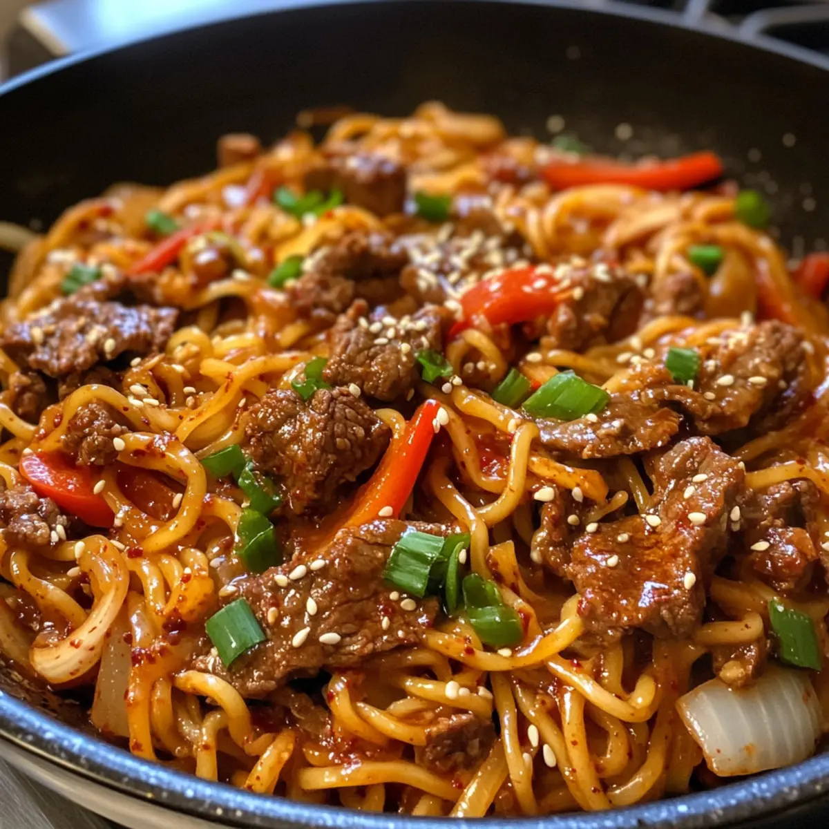 Scharfe koreanische Gochujang Rindfleischnudeln genießen
