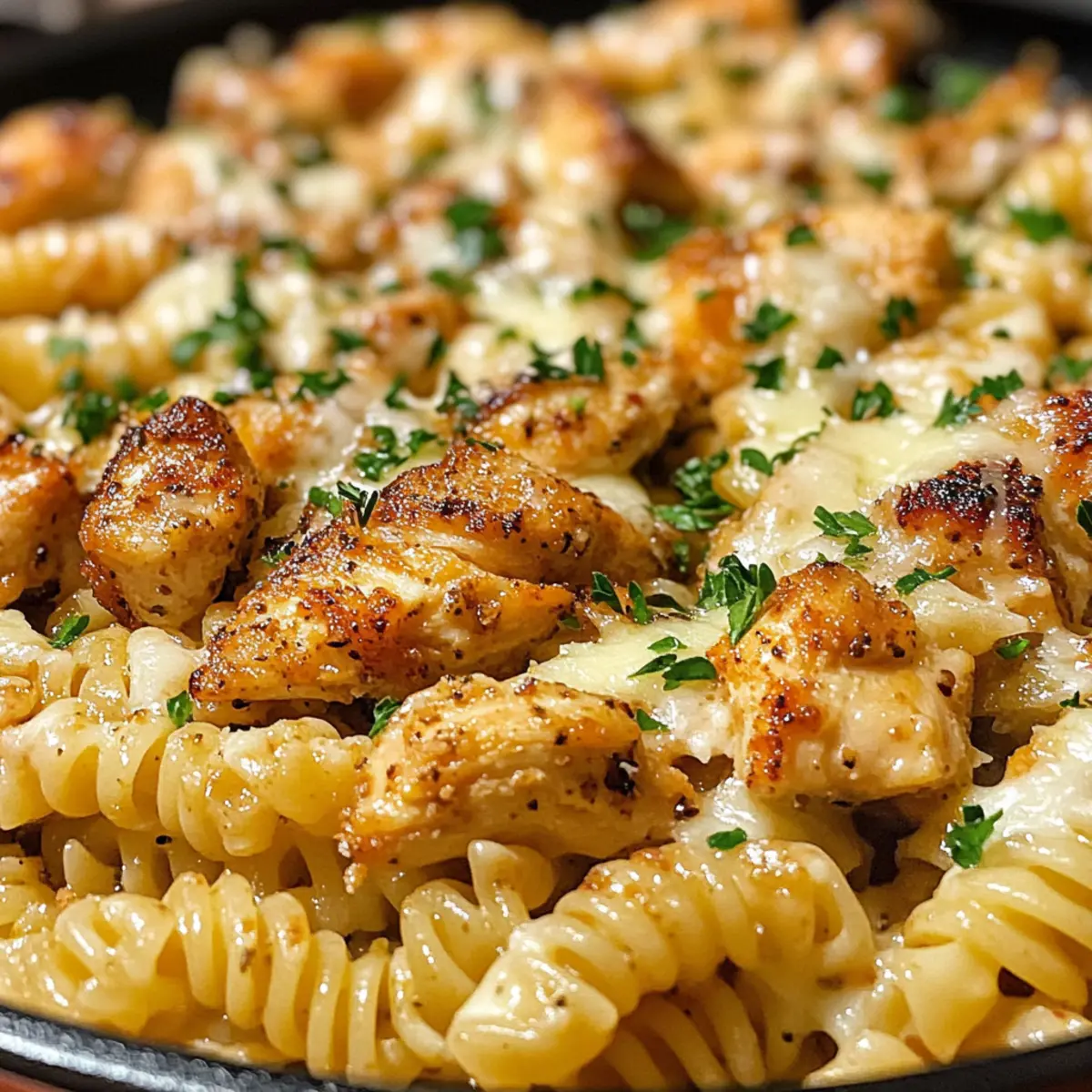 Käse Cajun Knoblauch Hähnchen Rotini in einer Pfanne