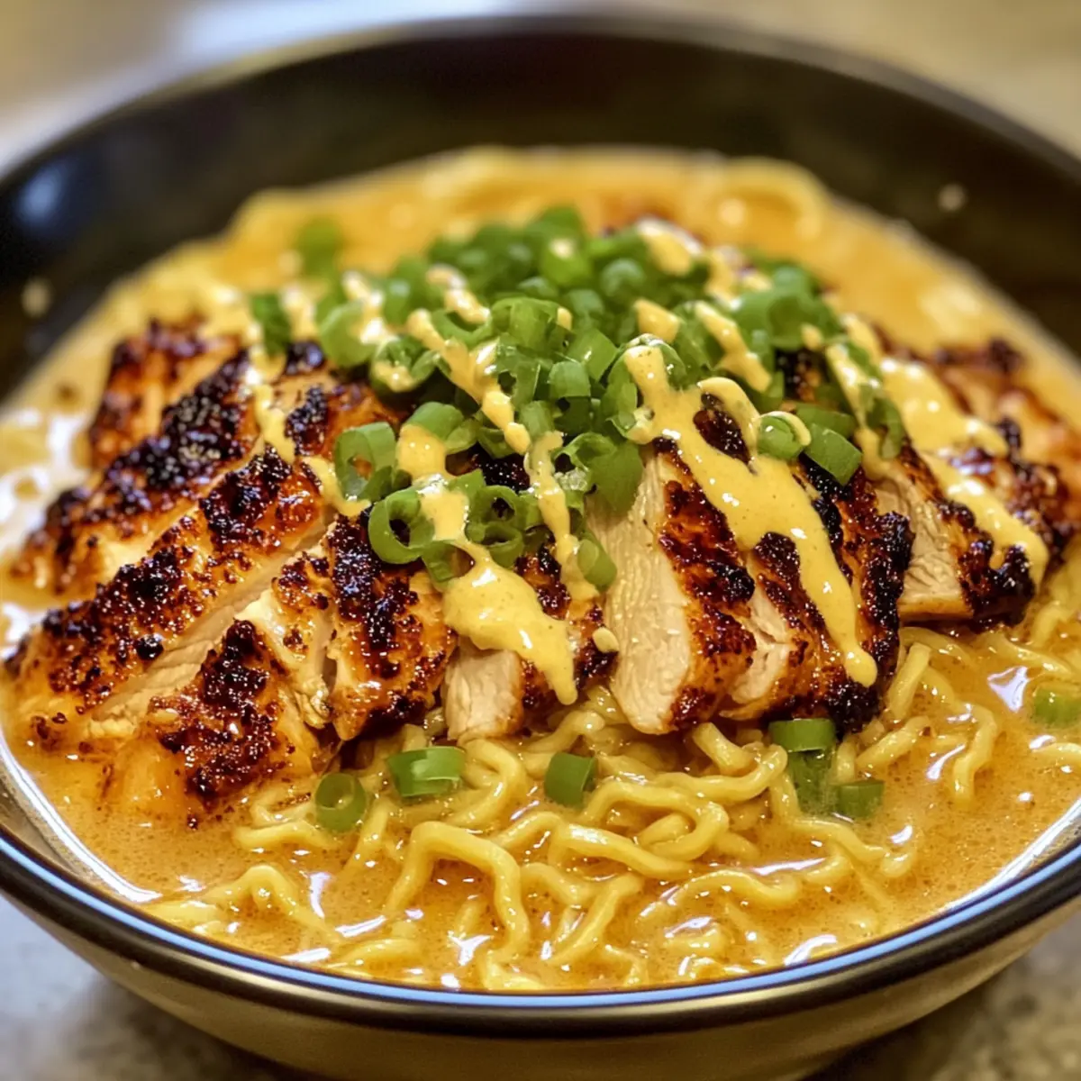 Feurige Hühnerramen mit cremiger Knoblauchsauce