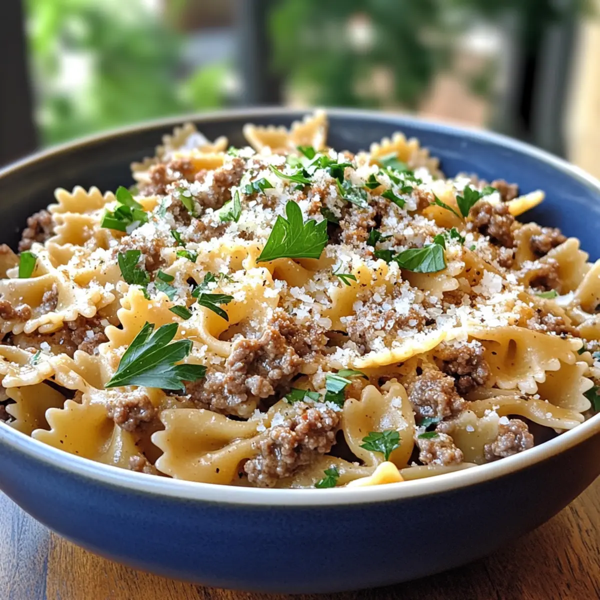 Knoblauchbutter-Schmetterlingsnudeln mit Rinderhackfleisch köstlich und schnell