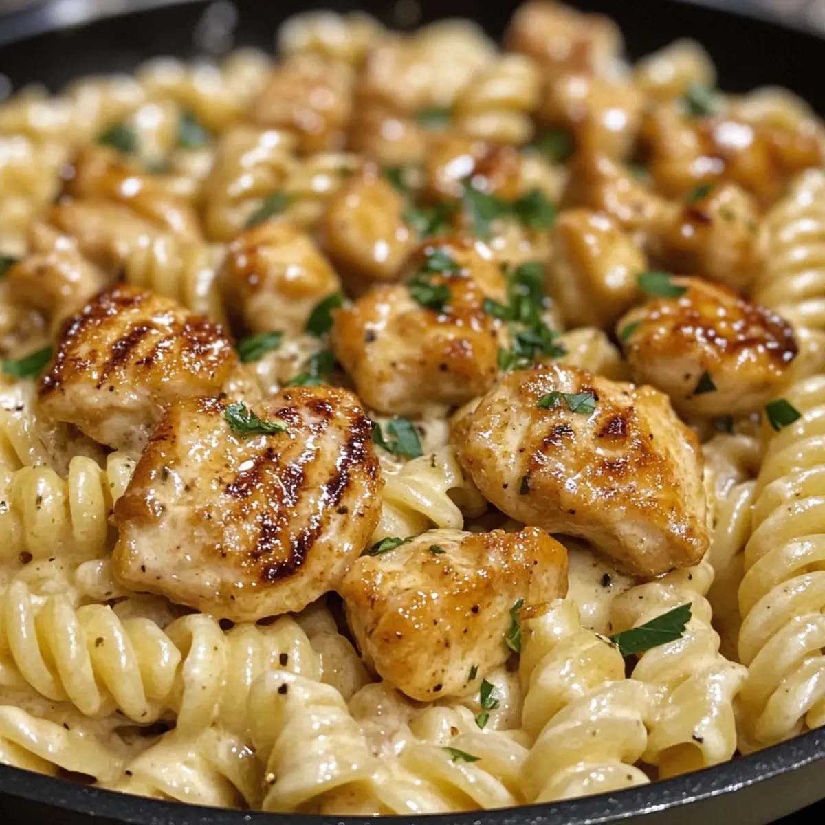 Verdrehte Pasta mit Honig-Knoblauch-Hühnchen genießen