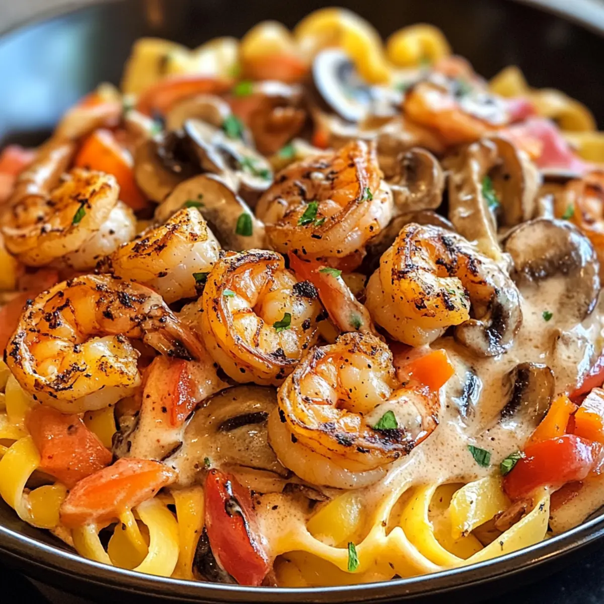 Schwarzgebratene Garnelen Stroganoff für jeden Tag