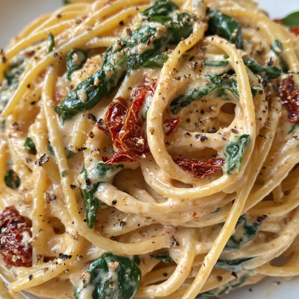 Spaghetti und Spinat mit getrocknetem Tomatencremesauce genießen