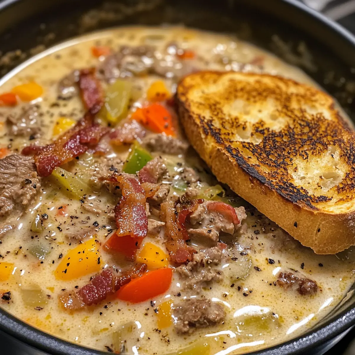 Cheesesteak-Suppe mit Speck und käsigem Toast genießen
