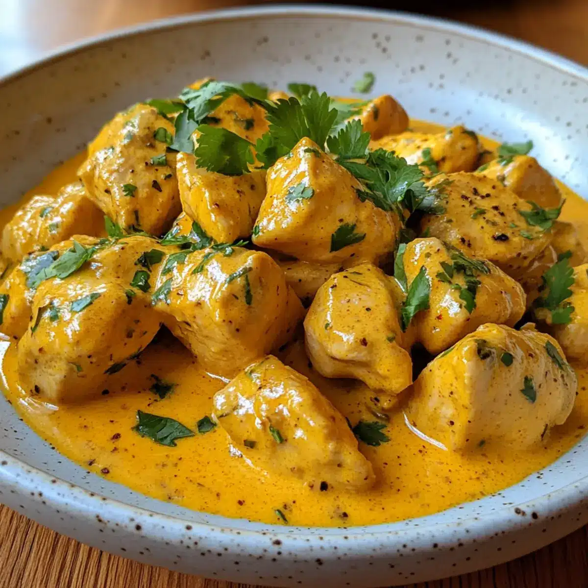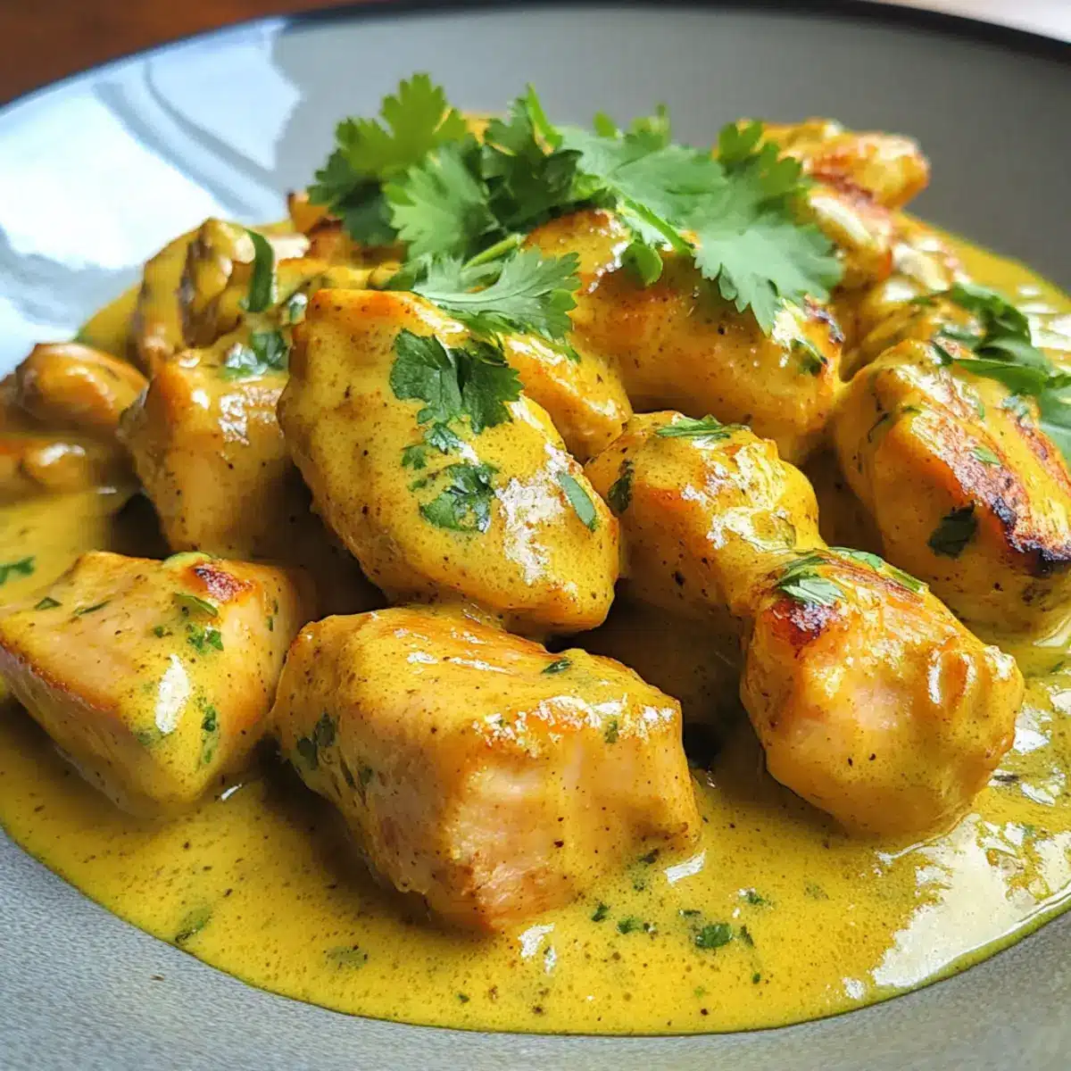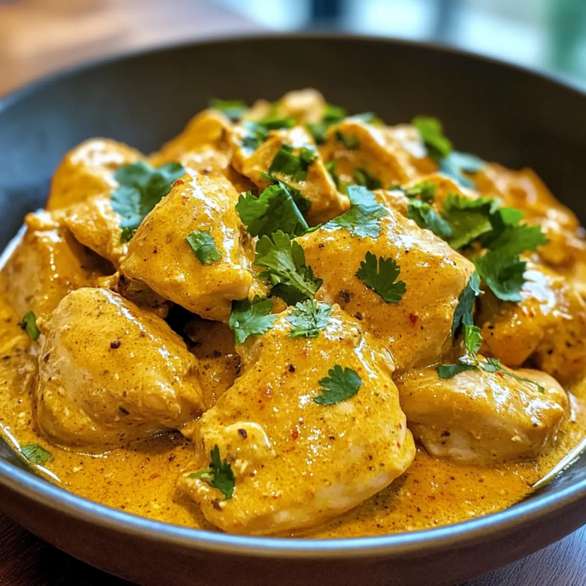 Gib die Schlagsahne oder alternativ die Kondensmilch in die Pfanne und rühre gut um, bis die Sauce gleichmäßig und leicht angedickt ist. Achte darauf, dass die Sauce eine cremige Konsistenz hat, die das Hähnchen perfekt umhüllt.