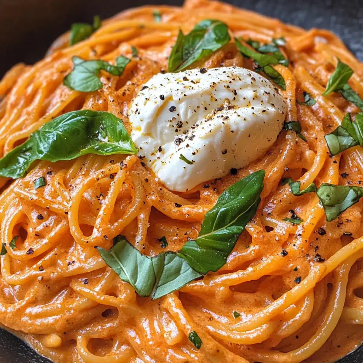 - Serviere die Pasta mit zerreißener Burrata und frischem Basilikum.