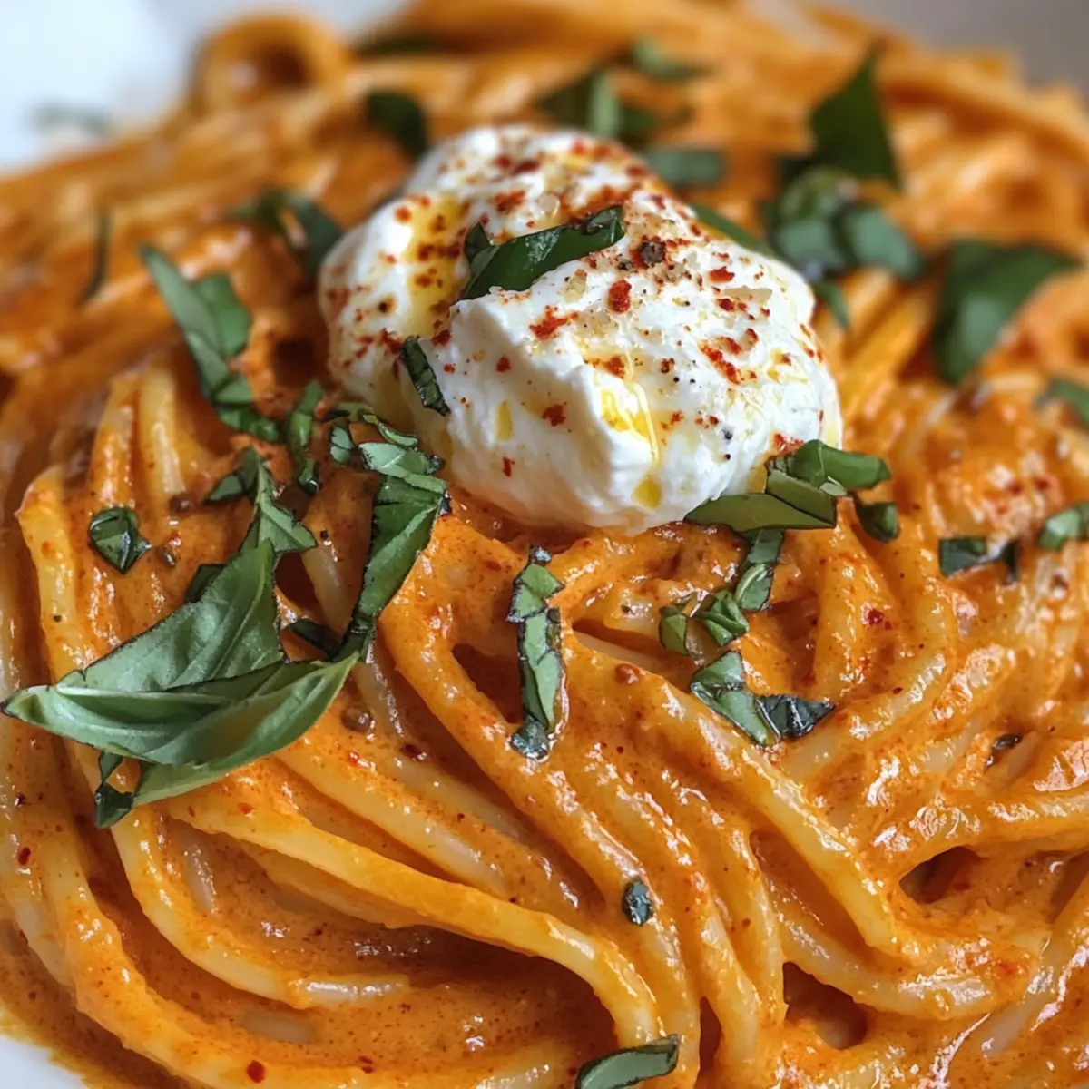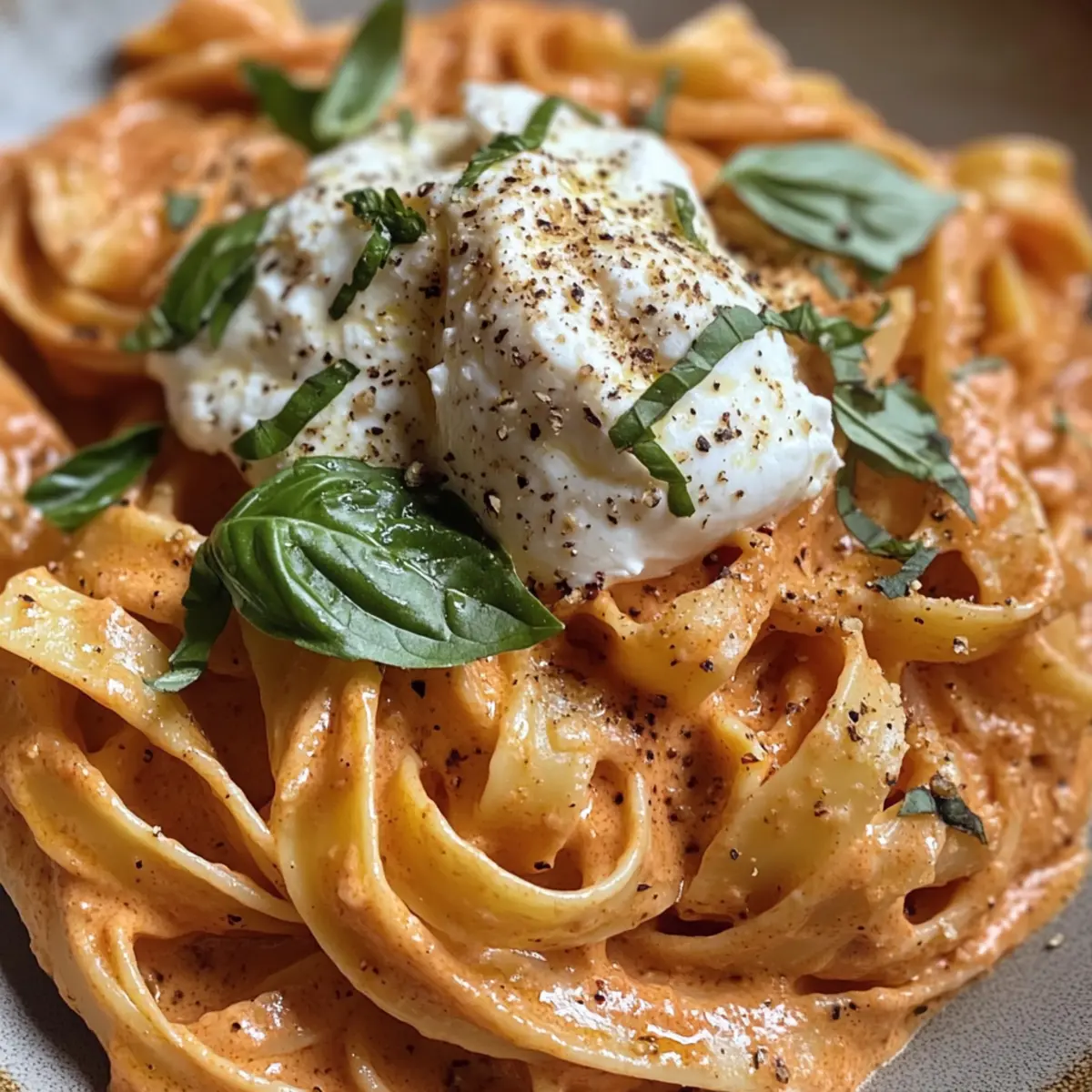 Verteile die cremige rote Paprika Pasta auf Servierplatten oder in Schalen. Zerreiße die Burrata über den Tellern, damit sie sanft schmilzt und sich in die Pasta integriert. Garniere das Gericht mit frischem Basilikum für einen intensiven Frischekick und serviere es sofort.