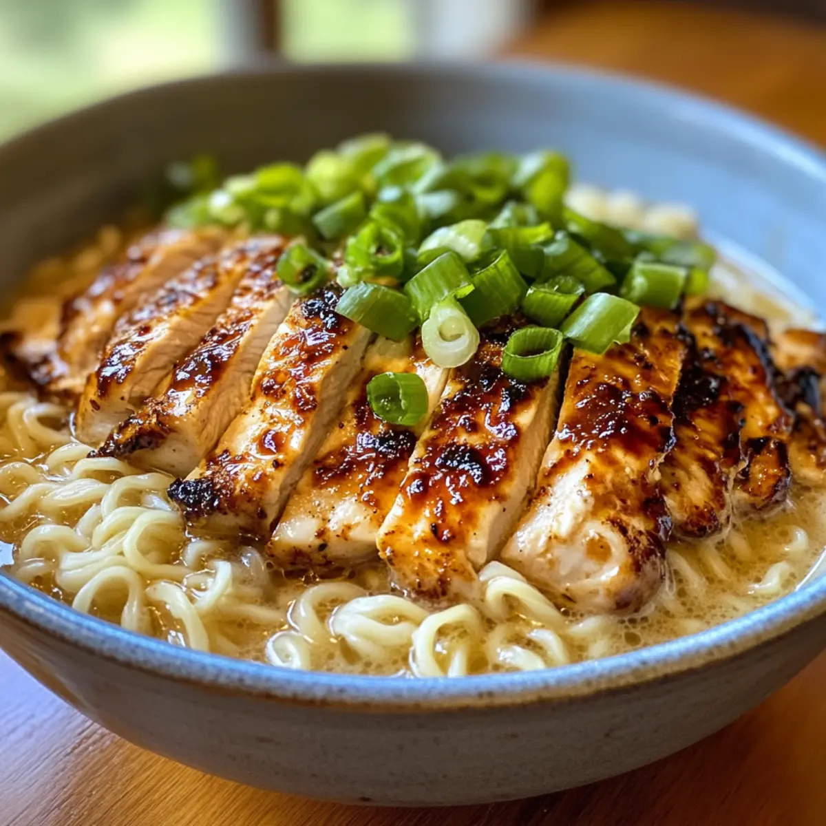 - Verteilen Sie die gekochten Ramen-Nudeln auf Schalen, gießen Sie die Brühe darüber, fügen Sie die Hühnchenscheiben hinzu, beträufeln Sie mit der Knoblauchsauce und garnieren Sie mit Frühlingszwiebeln und Chili-Öl.