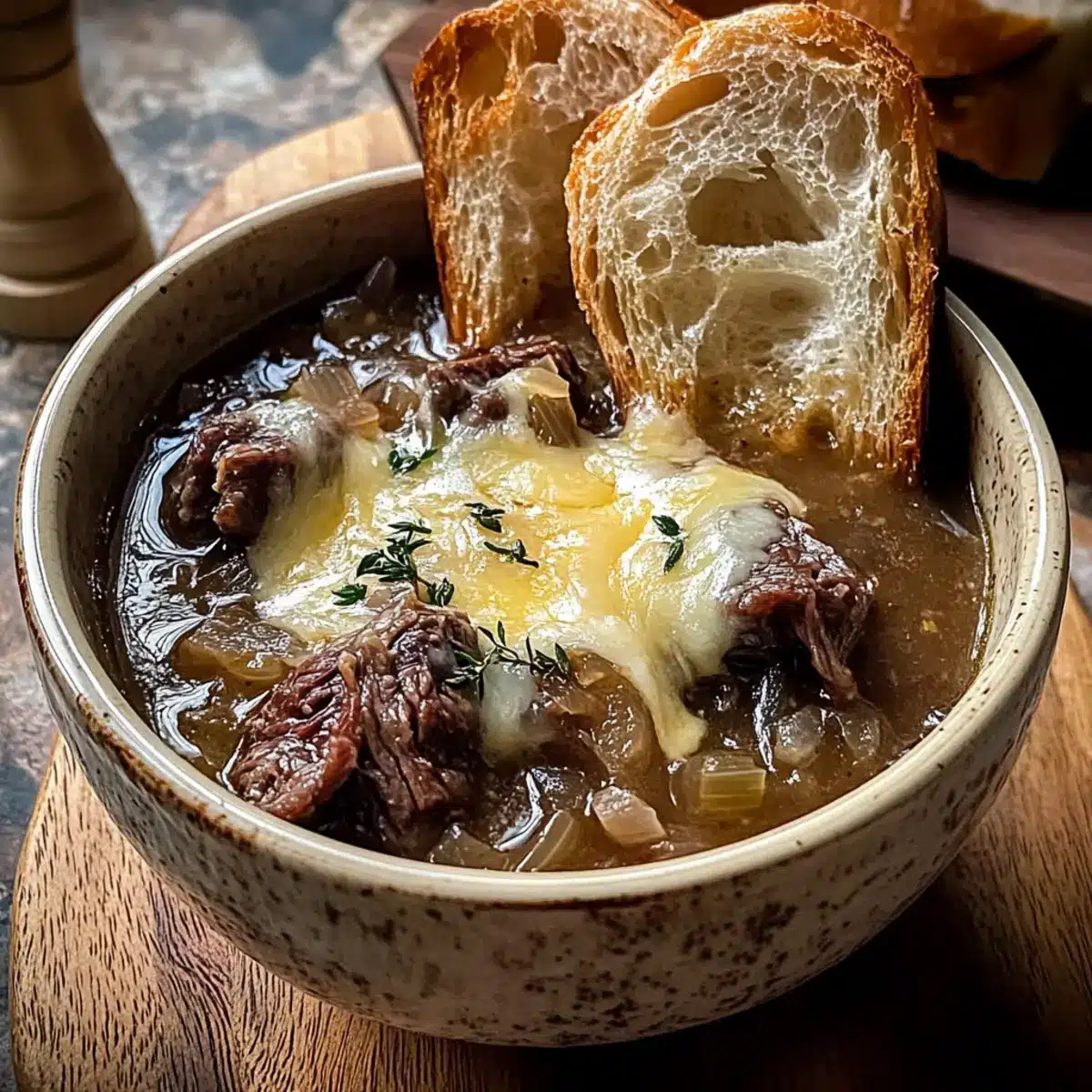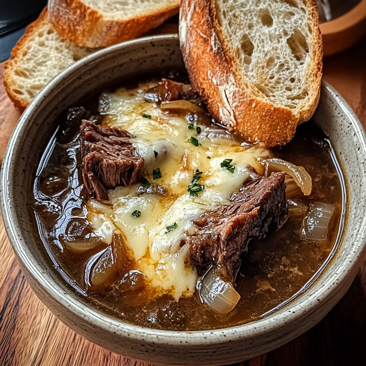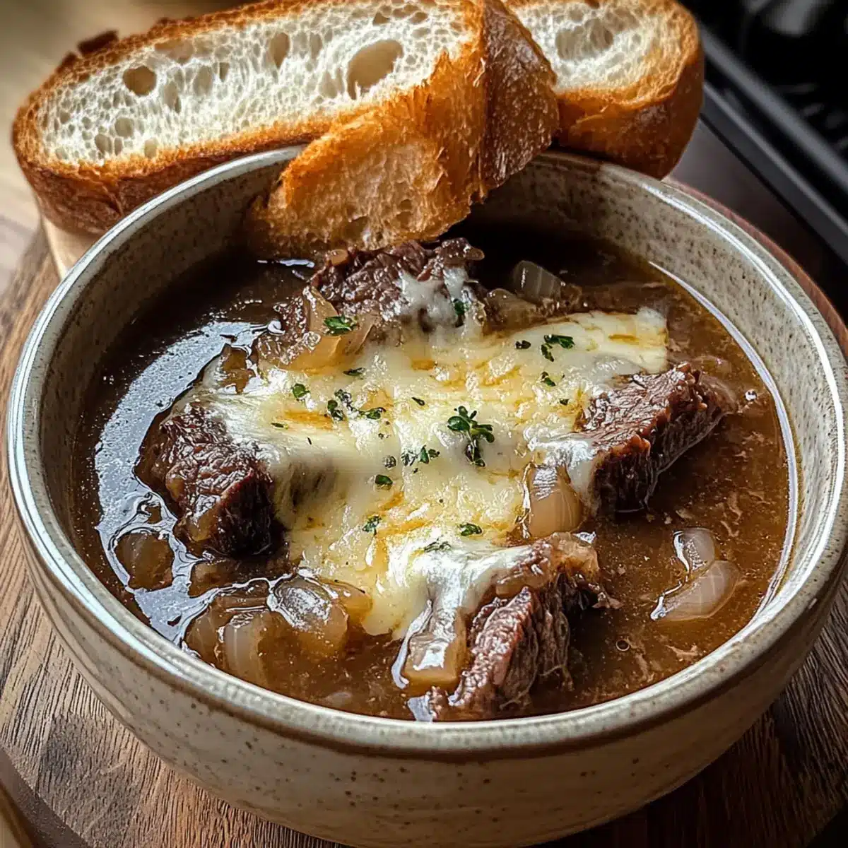 Französische Zwiebel-Rinderkoteletts-Suppe für Gemütlichkeit