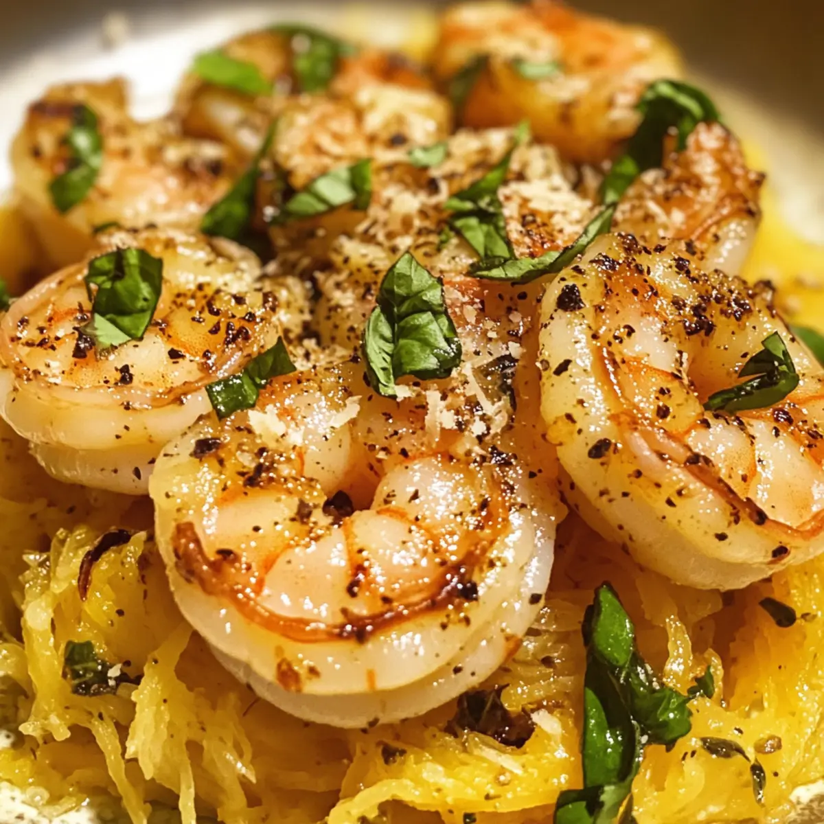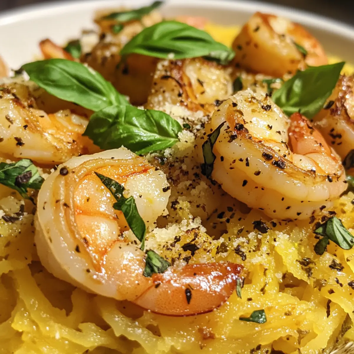 - Serviere die Garnelen Scampi über den Spaghetti-Kürbissträngen mit frisch geriebenem Parmesan.