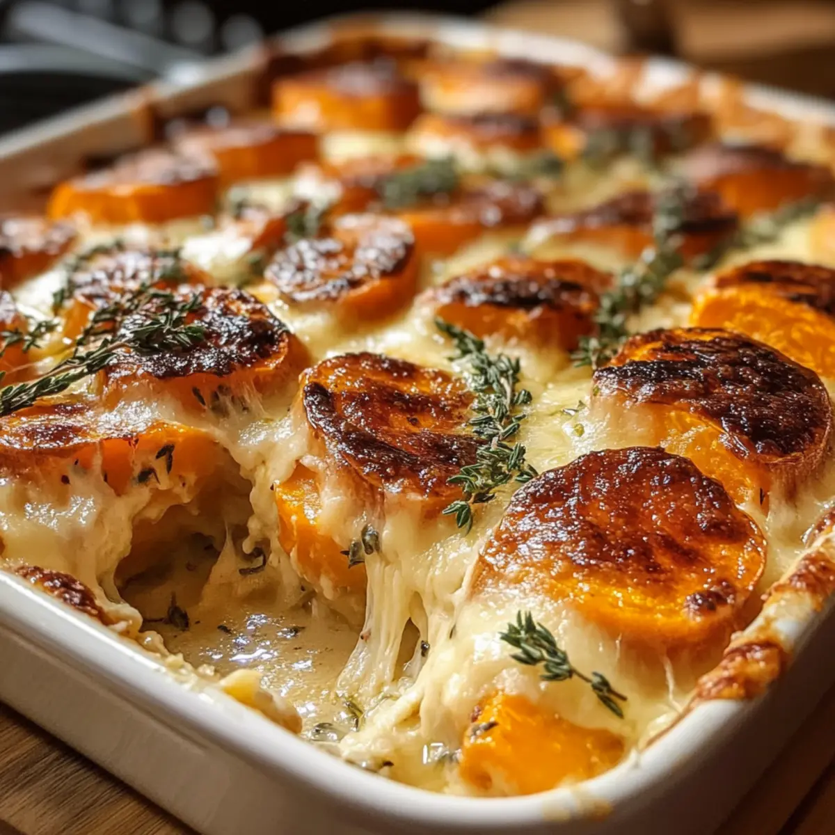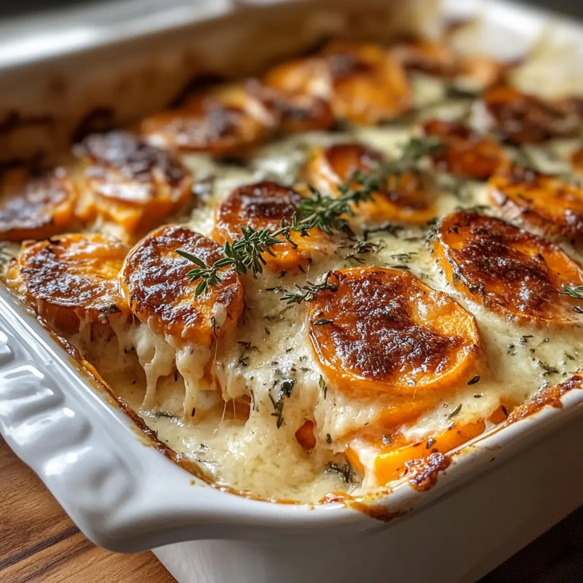 Nimm die Auflaufform aus dem Ofen und lasse die Süßkartoffeln für etwa 10 Minuten ruhen. Dies hilft, die Schichten zu setzen und die Aromen zu intensivieren. Vor dem Servieren optional mit frischer Petersilie oder Parmesan bestreuen, um eine zusätzliche geschmackliche Note zu verleihen.