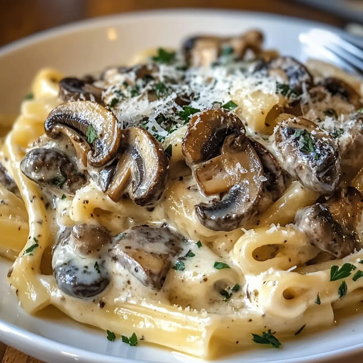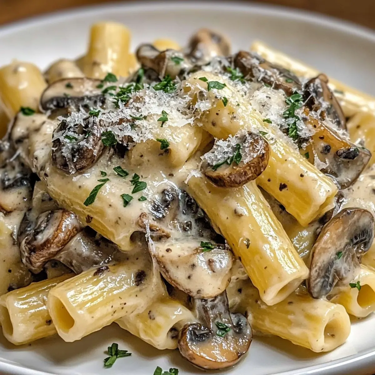 Richte die Pasta auf Tellern an und streue großzügig geriebenen Parmesan darüber, um einen herzhaften Abschluss zu bieten. Die Gorgonzola-Trüffel-Cremepilze sind nun fertig, um serviert zu werden und deinem Essen einen luxuriösen Touch zu verleihen.
