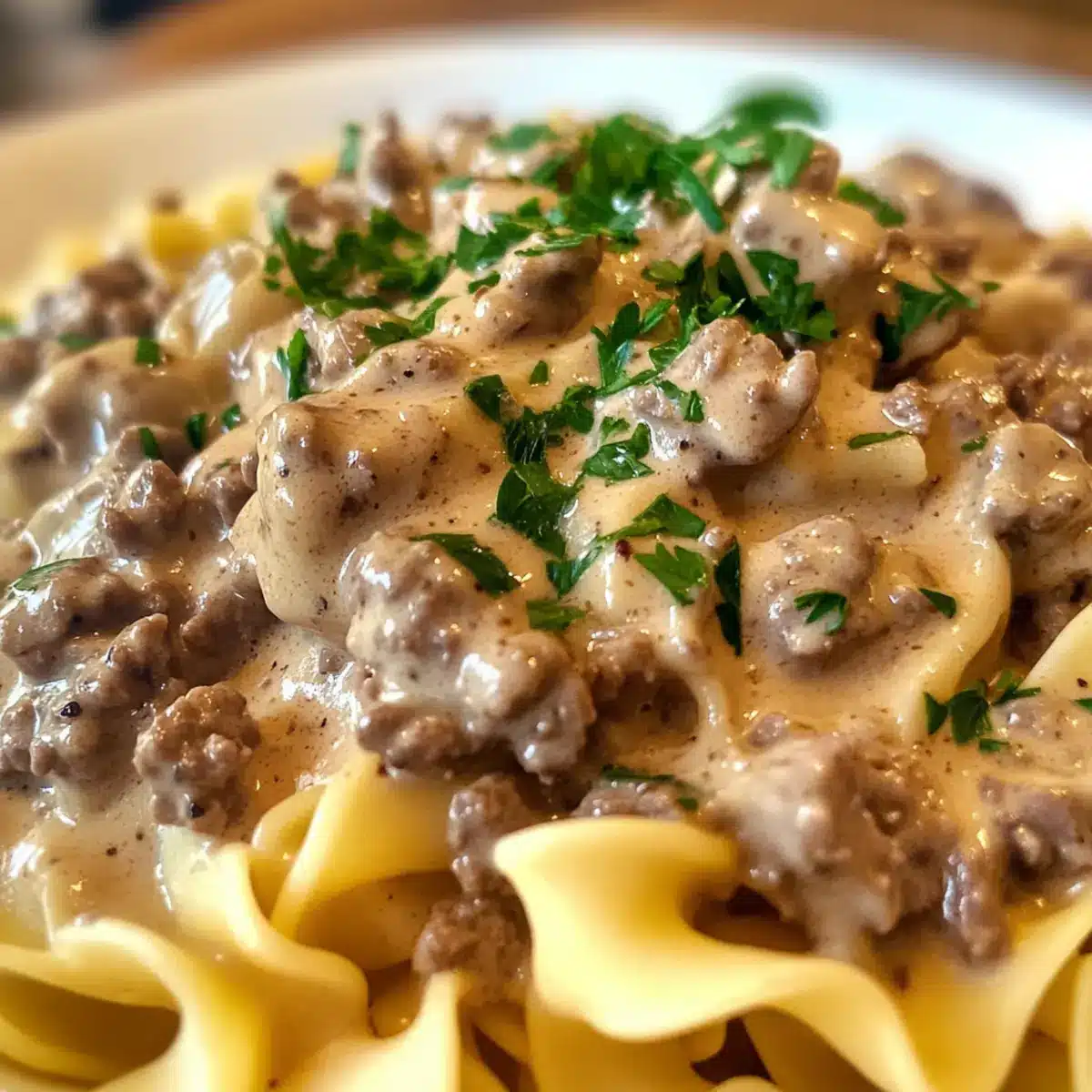Aromen intensivieren: Frische Kräuter wie Petersilie oder Schnittlauch am Ende hinzufügen, um eine frische Note zu verleihen. Sie machen dein Hamburger Stroganoff Rezept noch aromatischer.