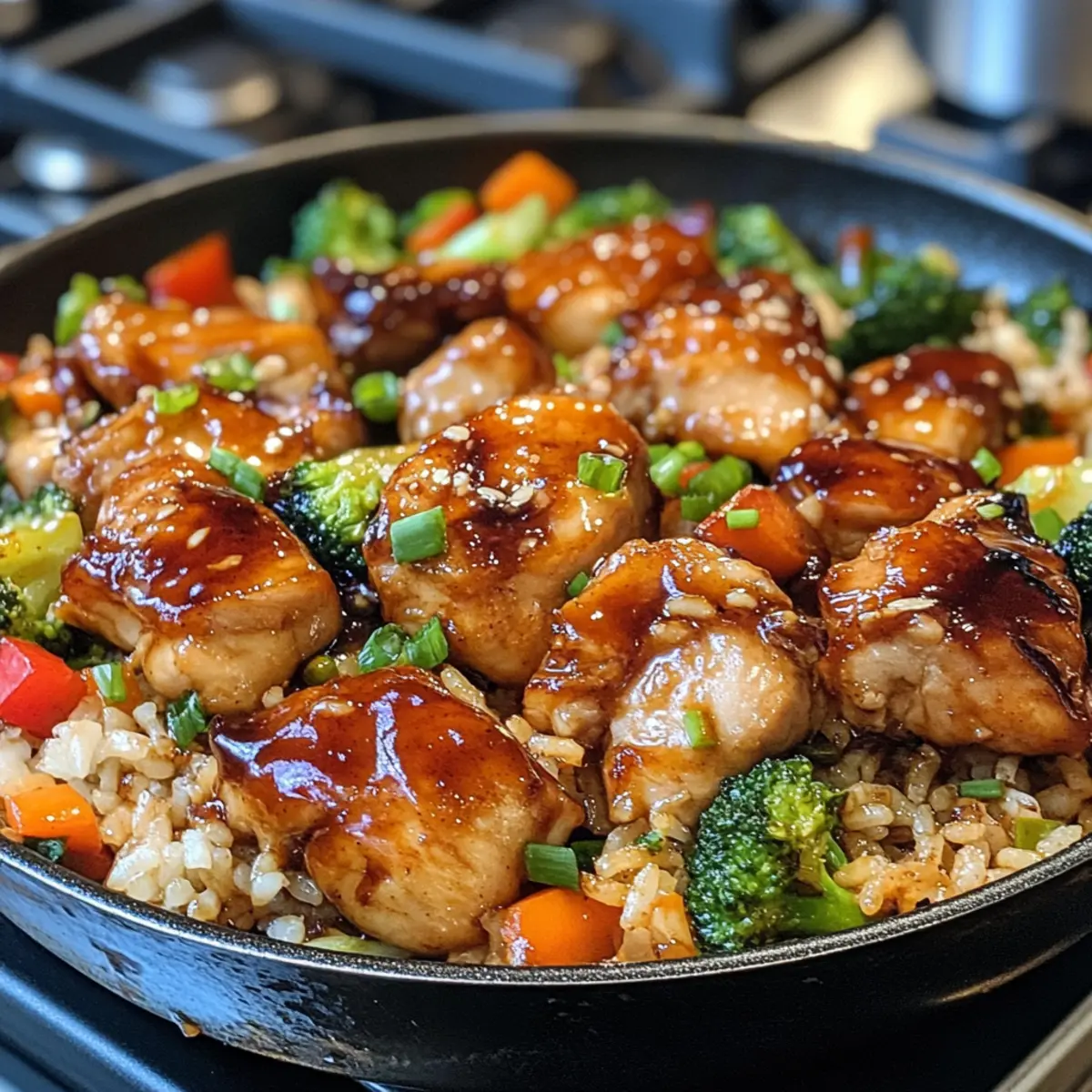 Honig BBQ Hähnchen Reis in einer Pfanne zubereiten