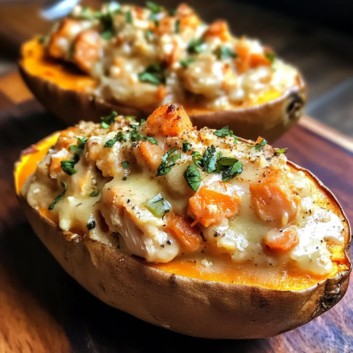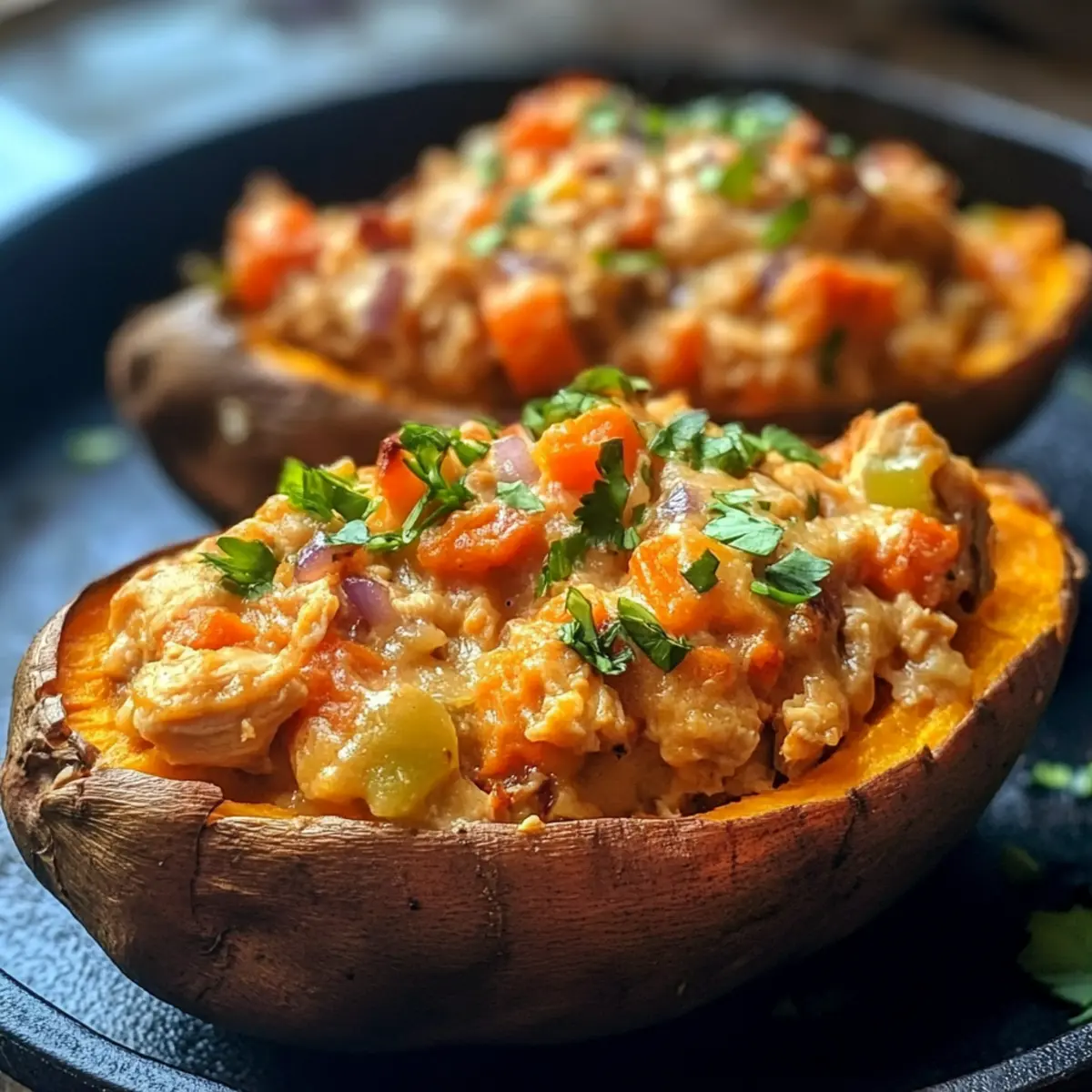 - Fülle die Süßkartoffeln mit der cremigen Hühnchenmischung und serviere sie heiß.