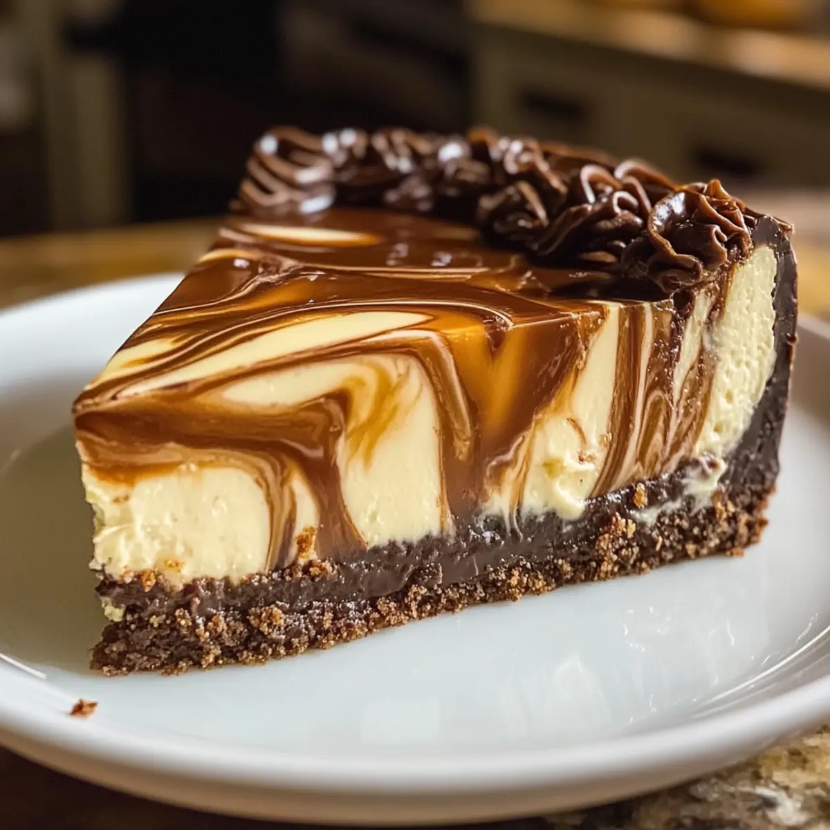 Gieße die Hälfte der Käsekuchenmasse gleichmäßig über den gekühlten Boden. Verteile etwas Karamellsauce und die optionale Schokoladenglasur darauf und ziehe mit einem Löffel oder einem Holzstäbchen spiralförmige Muster. Füge dann die restliche Käsekuchenmasse hinzu und glätte die Oberfläche sorgfältig.
