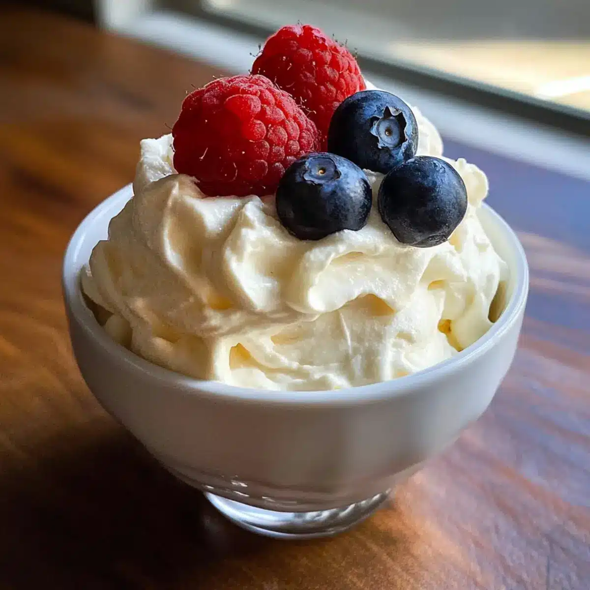 Frische Beeren: Himbeeren oder Erdbeeren bringen nicht nur Farbe, sondern auch eine fruchtige Frische, die den cremigen Fluff wunderbar ergänzt. Ihre natürliche Süße harmoniert perfekt mit dem leichten Käsekuchen-Geschmack.