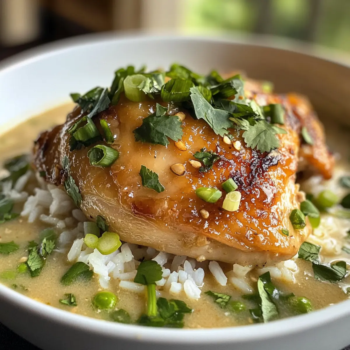 Schnitze das gekochte Hühnchen in Scheiben und serviere es in Schalen über einer Portion Reis. Gieße die heiße, aromatische Brühe großzügig darüber und garnieren das Gericht mit Frühlingszwiebeln, frischem Koriander und Limettenschnitzen. Diese frischen Zutaten verleihen deinem Kokosnuss-Hühnchen-Brühe Reis das perfekte Finish.