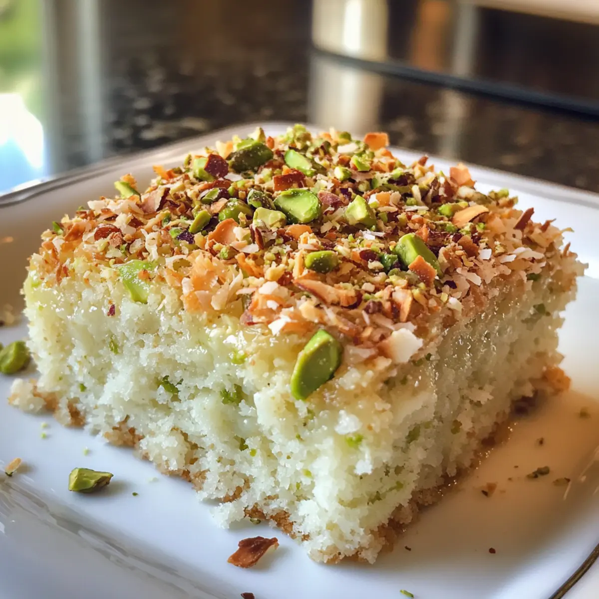 Kokosnuss- und Pistazienpuddingkuchen für Feierlaune