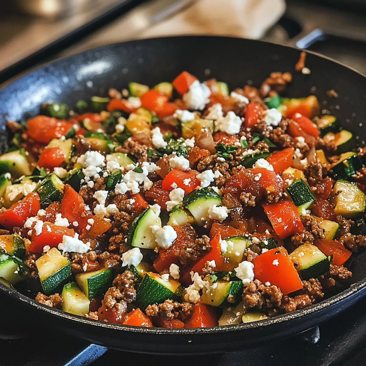 Füge die zerkleinerten Zucchini und die gewürfelte rote Paprika in die Pfanne. Koche das Gemüse für 3–5 Minuten, bis es leicht zart, aber immer noch knusprig ist. Achte darauf, die Farben lebendig zu halten, damit das Mediterranes Rinderhackfleisch Pfannengericht appetitlich aussieht.