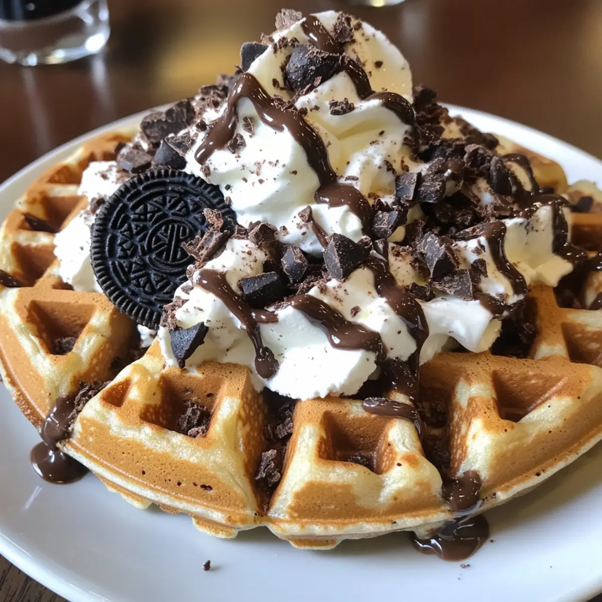- Waffeln servieren und nach Belieben mit Schlagsahne oder weiteren Oreo-Keksen garnieren.