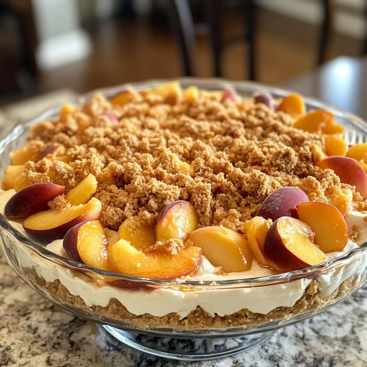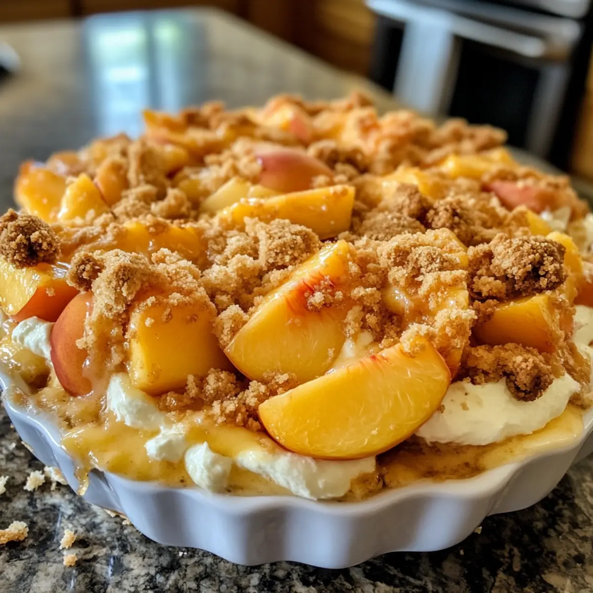 Knusprige Texturen: Die buttrige Graham-Cracker-Kruste verleiht dem Gericht eine unwiderstehliche Knusprigkeit, die perfekt zu den weichen Pfirsichen passt.