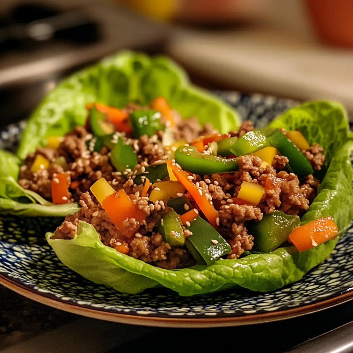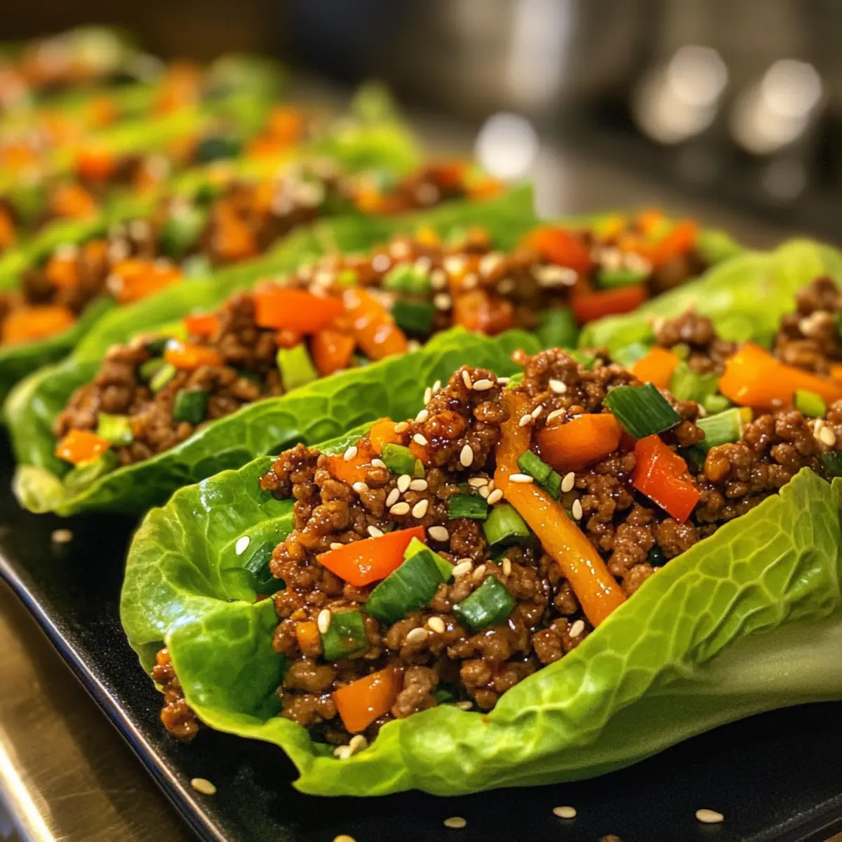 - Nimm frische Salatblätter und löffle die Rinderhackfleischmischung hinein. Garniere die Wraps mit Frühlingszwiebeln oder gerösteten Sesamkörnern.