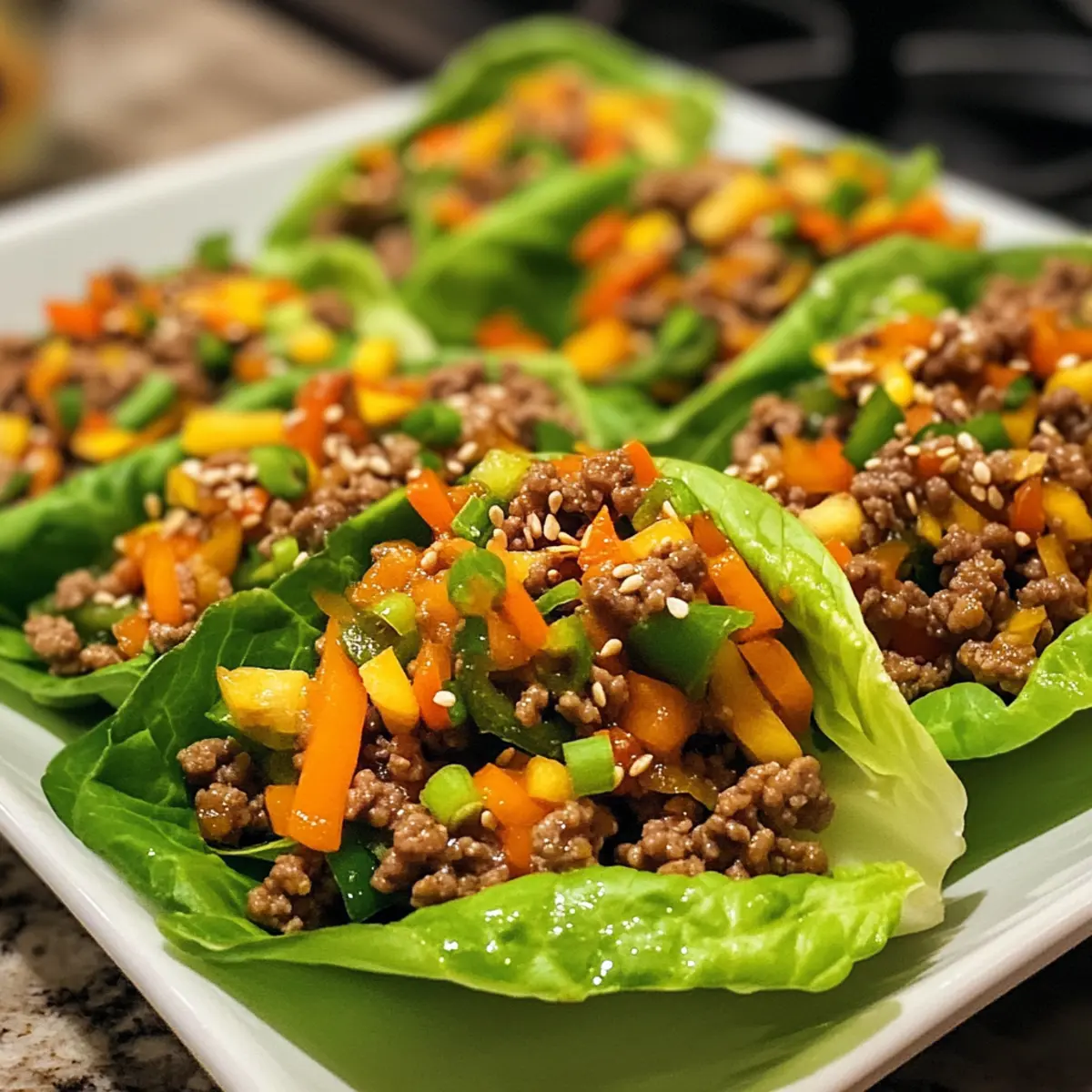 Sobald die Füllung fertig ist, nimm frische Salatblätter (z. B. Boston Bibb) und löffle die Rinderhackfleischmischung hinein. Garniere die Wraps nach Belieben mit Frühlingszwiebeln oder gerösteten Sesamkörnern. Diese Rinderhackfleisch Salatwickel sind nun bereit zum Genießen – erlebe die Kombination aus knackigem Blatt und herzhaftem Inhalt!