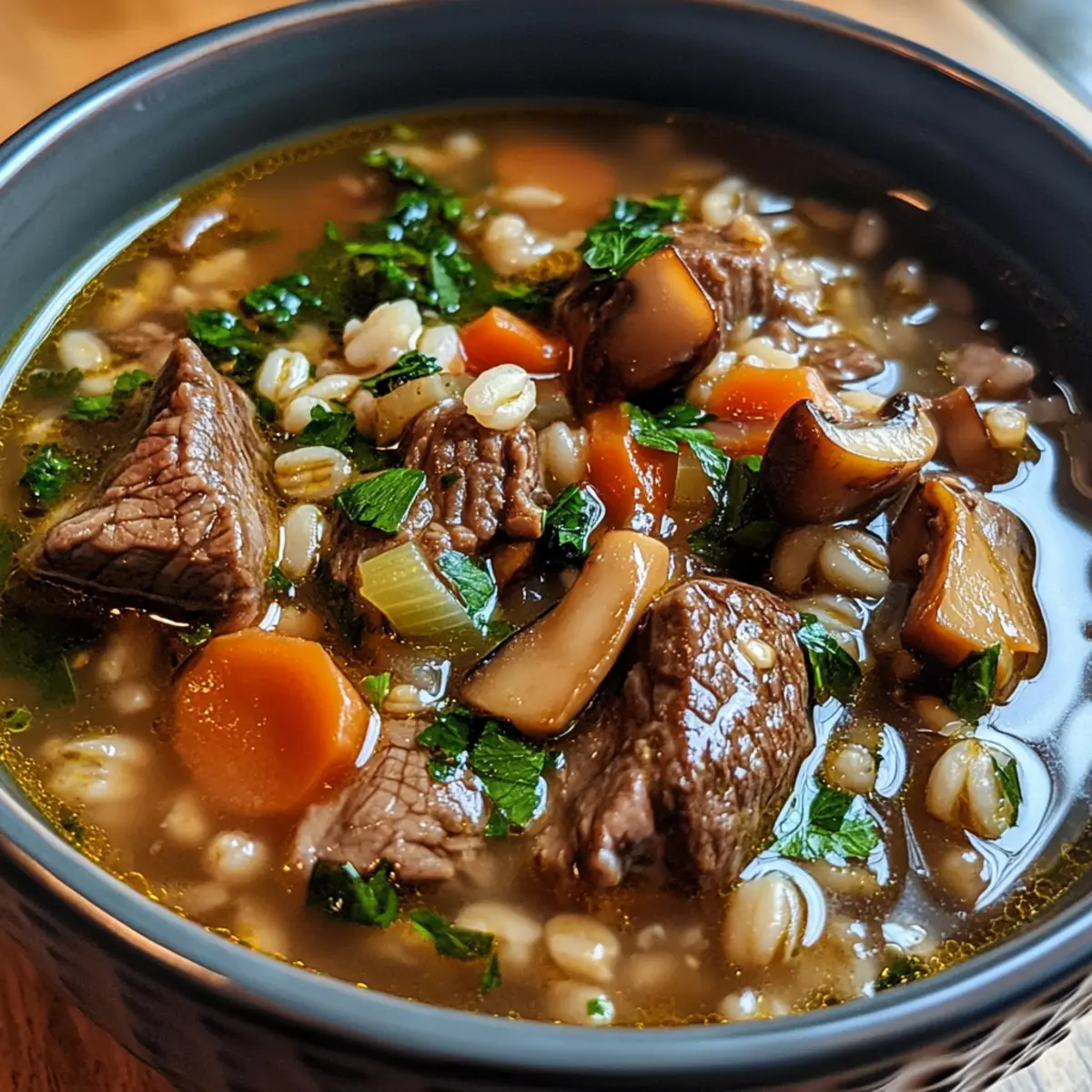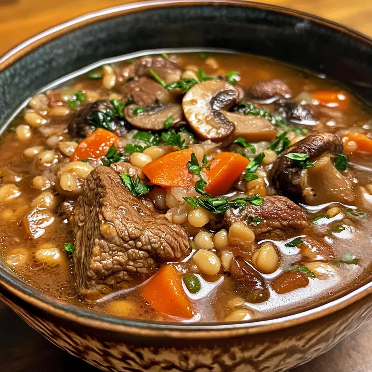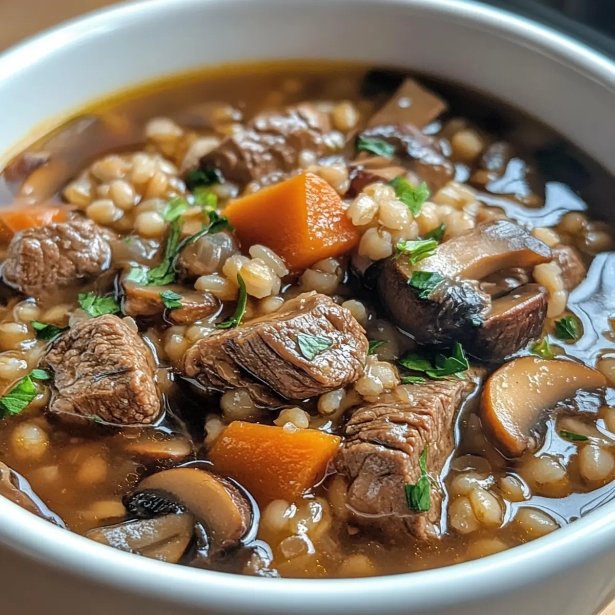 Herzhafter Geschmack: Die Kombination aus zartem Rindfleisch, nussiger Gerste und karamellisierten Pilzen schafft ein unverwechselbares Geschmackserlebnis, das wärmend und sättigend ist.