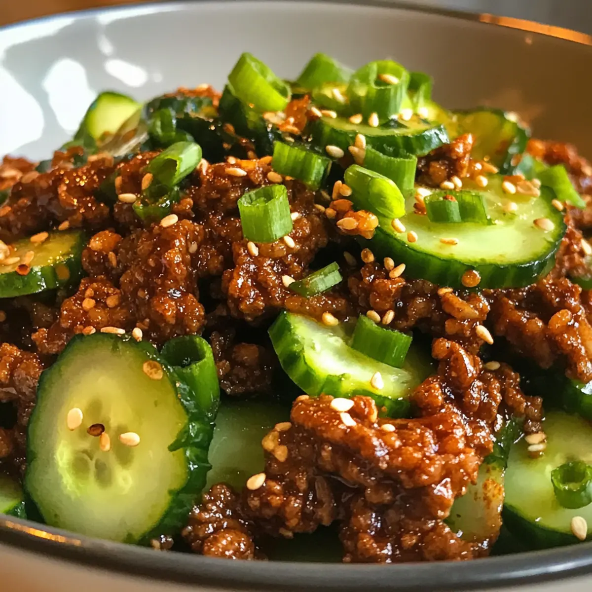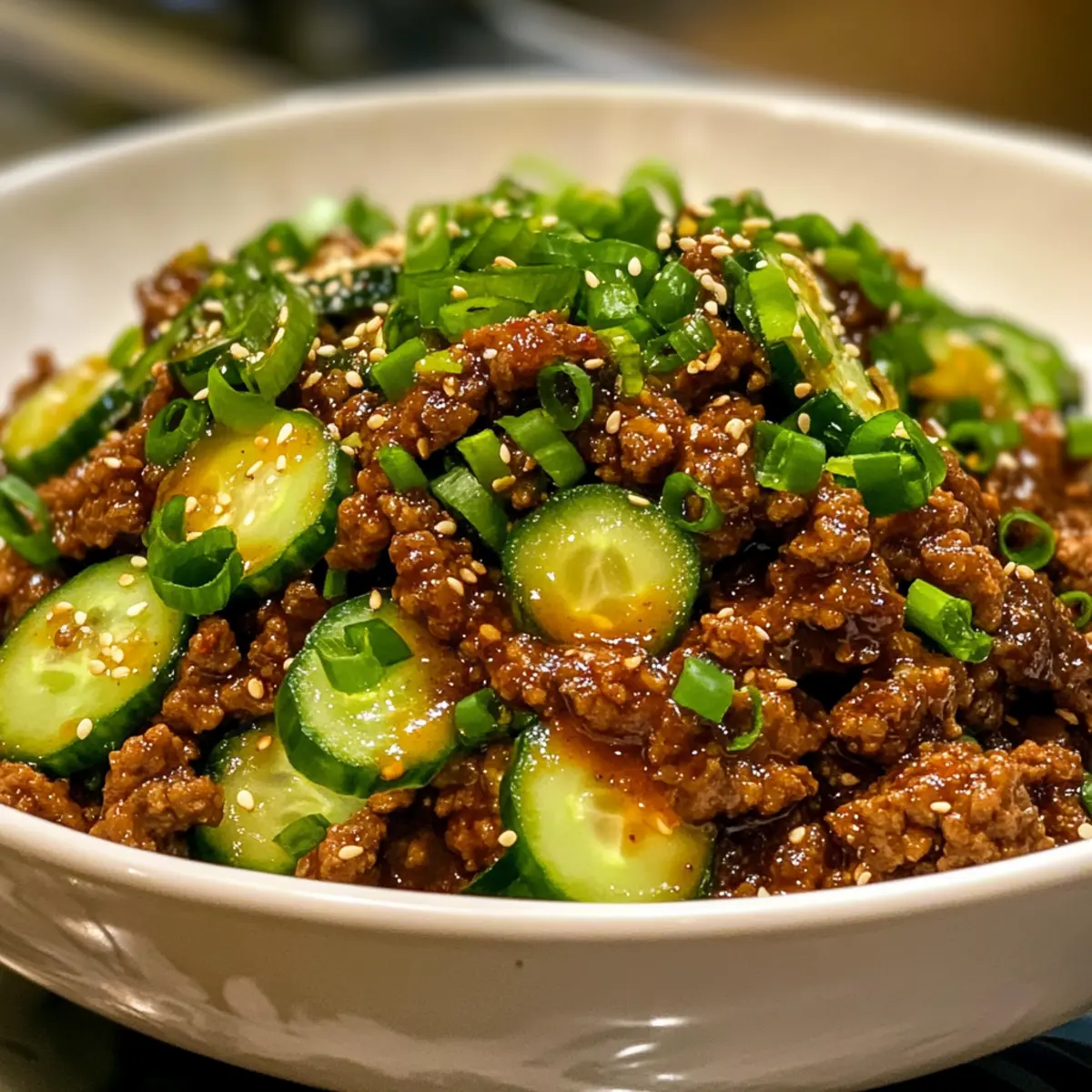 Erlebe die perfekte Balance aus scharfem Rindfleisch und erfrischendem Gurkensalat mit diesem Rezept für scharfes Keto koreanisches Rindfleisch!