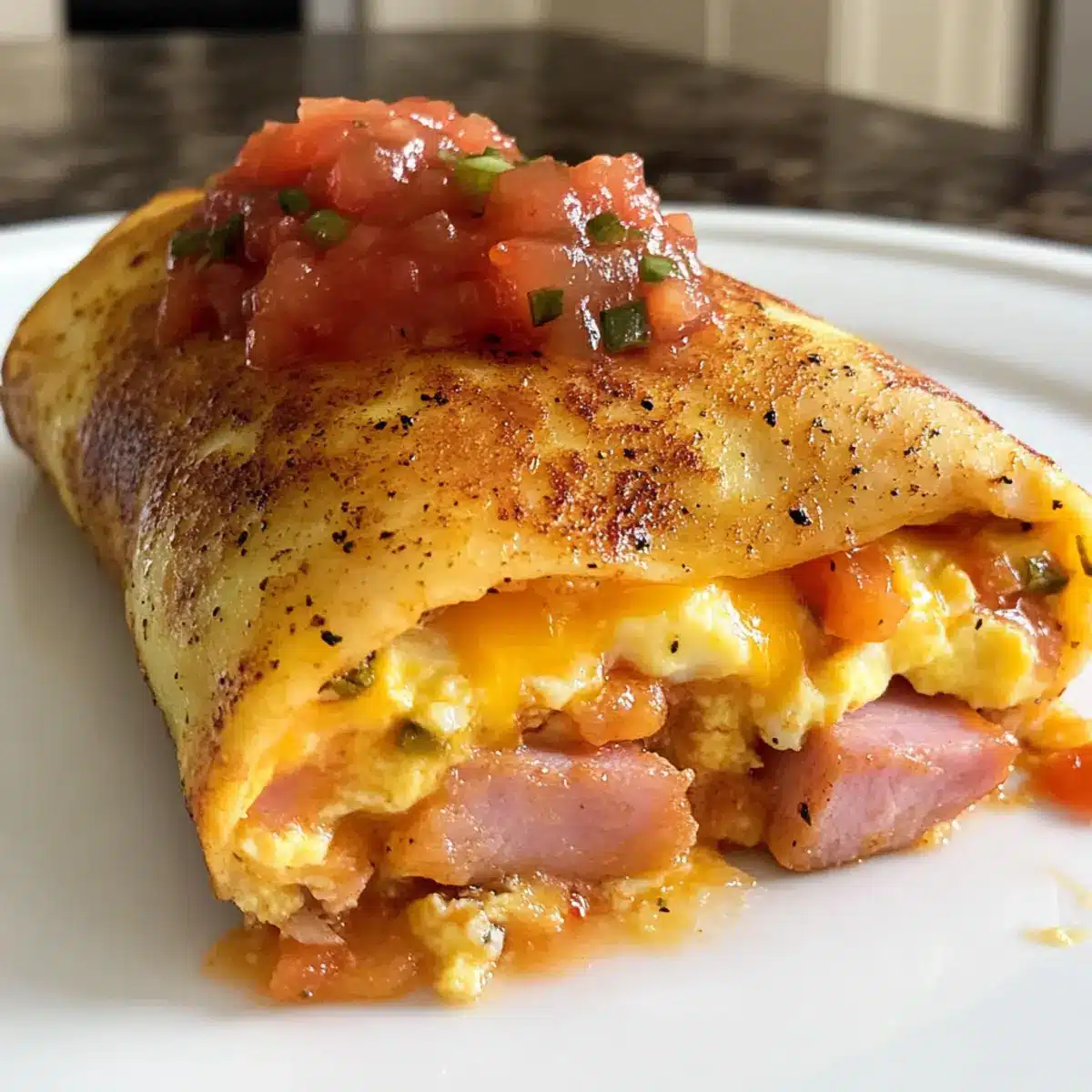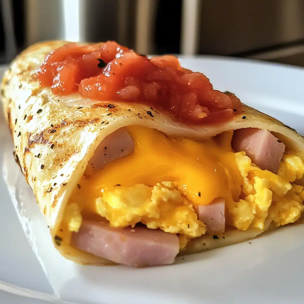 Genießen Sie die Schinken-Ei-und-Käse-Röllchen (mit Salsa) als Teil eines köstlichen Frühstücks, das alle Sinne anspricht und jeden Biss zum Erlebnis macht.