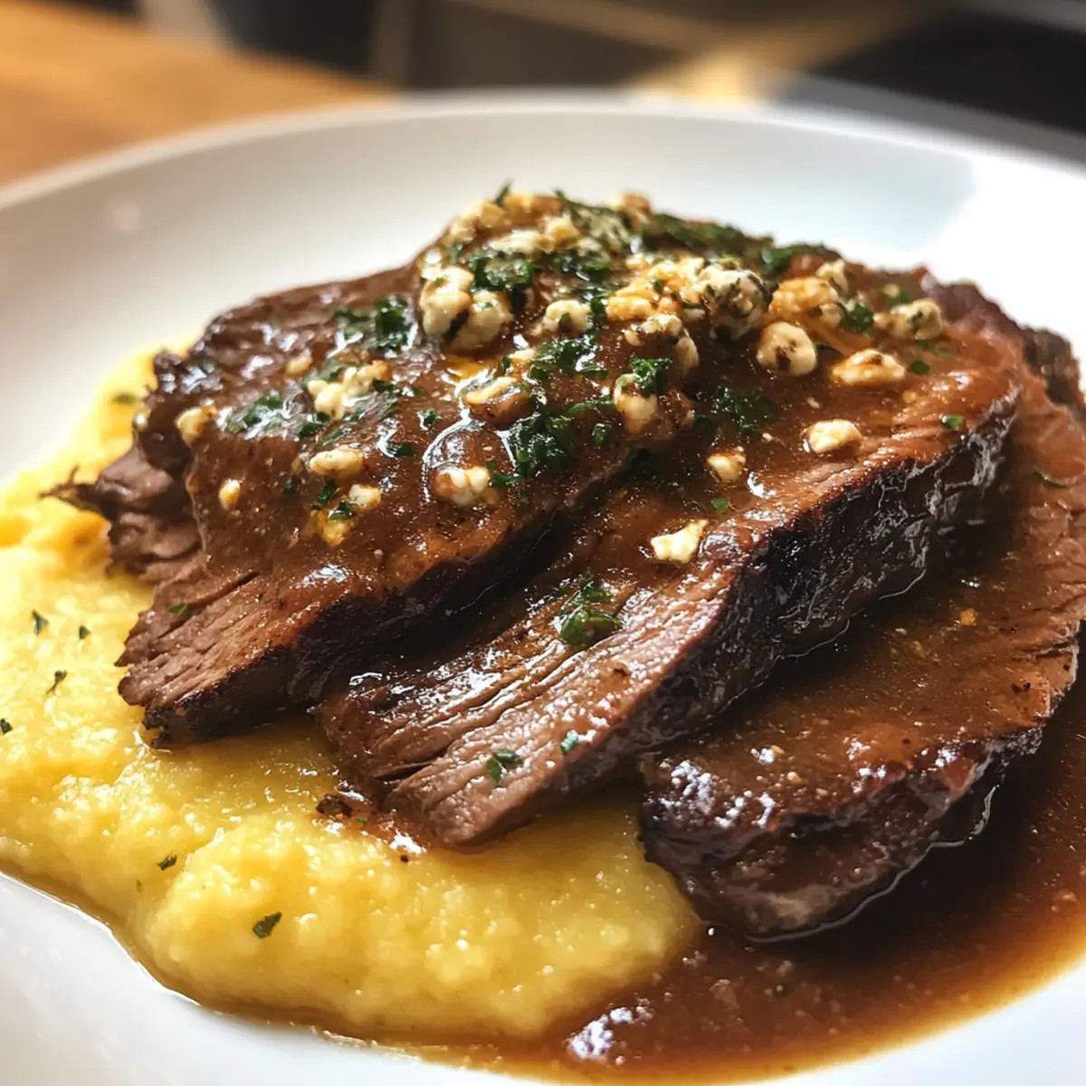 Cremige Gorgonzola-Polenta: Diese weiche Beilage besteht aus mildem Gorgonzola und passt hervorragend zum herzhaften Stracotto und nimmt die reichhaltige Sauce auf.