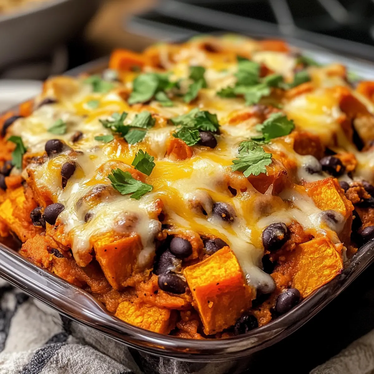 Herzhaft und nahrhaft: Diese Süßkartoffel Schwarzbohne Casserole bietet eine perfekte Kombination aus Geschmack und Nährstoffen, die jeden essenden Genießer begeistert.