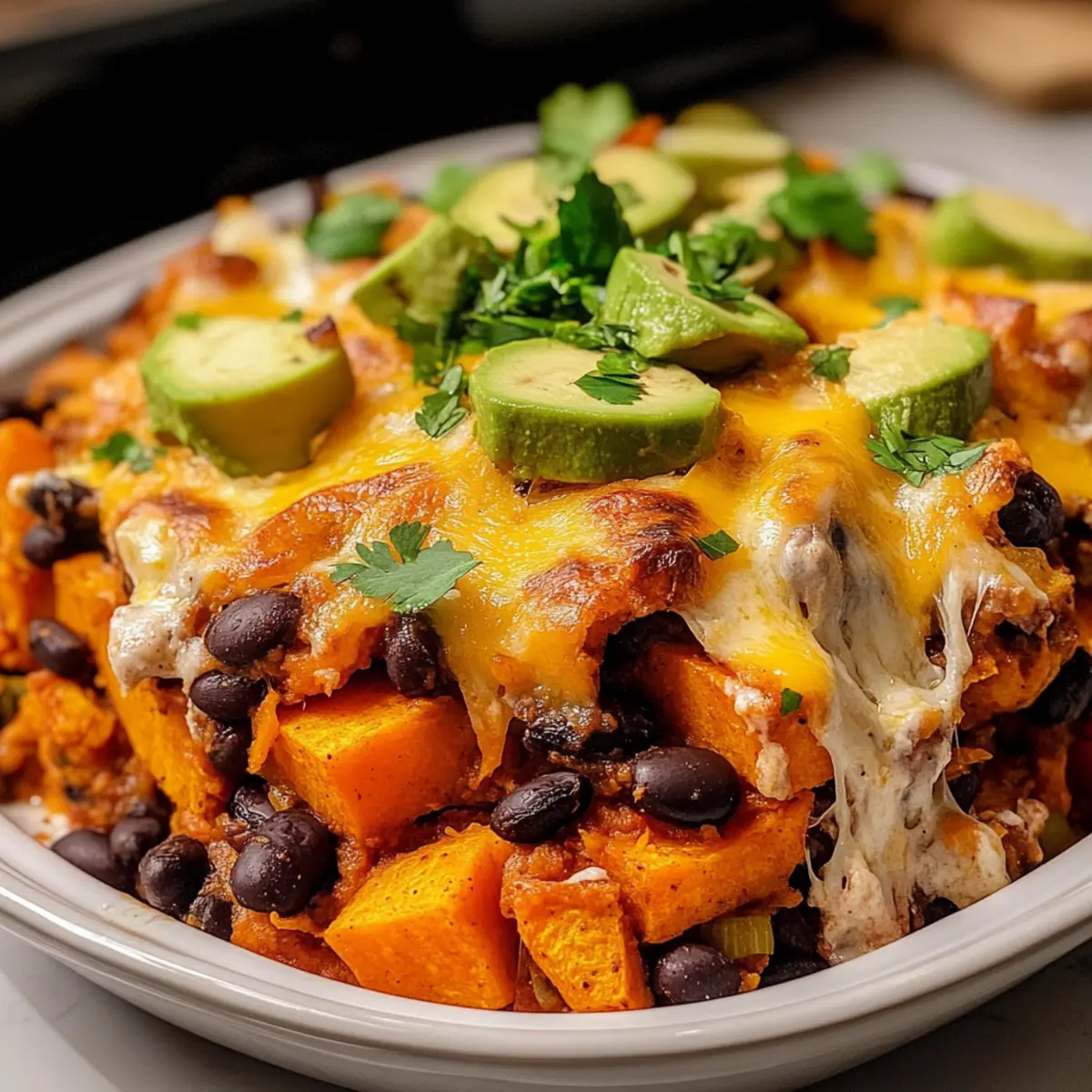Lass den Auflauf ein paar Minuten abkühlen, bevor du ihn anschneidest. Dies hilft, die Schichten zu festigen. Garniere ihn nach Belieben mit Avocado oder Sauerrahm, um noch mehr Geschmack und Frische zu verleihen. Jetzt ist dein köstlicher Süßkartoffel Schwarzbohnen Auflauf bereit zum Servieren!