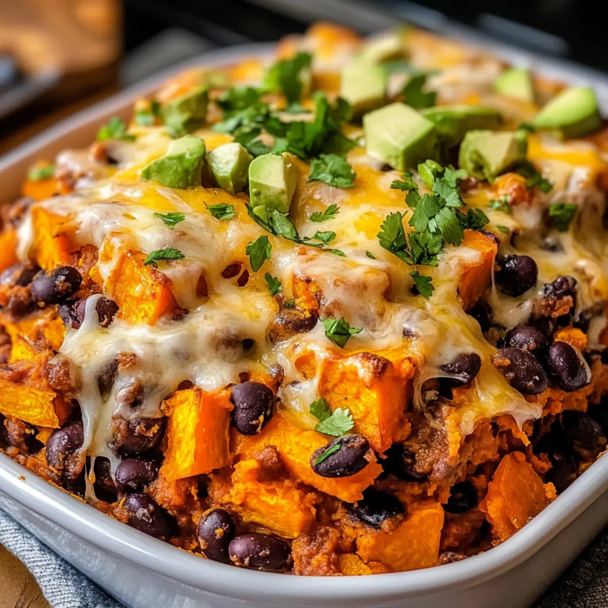 Der Süßkartoffel Schwarzbohnen Auflauf ist ideal für die Vorbereitung im Voraus und schont deine Zeit an hektischen Wochentagen! Du kannst die Süßkartoffeln bis zu 24 Stunden vorher schälen und würfeln sowie mit Olivenöl und Gewürzen vermengen, um den Garprozess zu beschleunigen. Lagere die gewürzten Stücke in einem luftdichten Behälter im Kühlschrank. Auch die Gemüsefüllung lässt sich gut vorbereiten und kann bis zu 3 Tage im Voraus zubereitet werden. Wenn du bereit bist zu servieren, simply backe den Auflauf für 15-20 Minuten bei 200°C (400°F), bis der Käse schön geschmolzen und goldbraun ist. So hast du ein köstliches, zeitgerafftes Essen, das einfach genauso lecker bleibt!