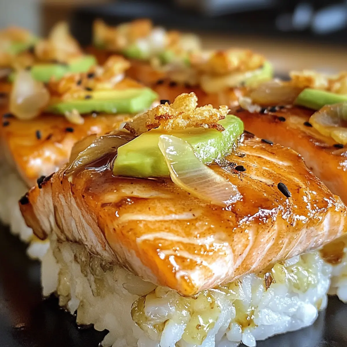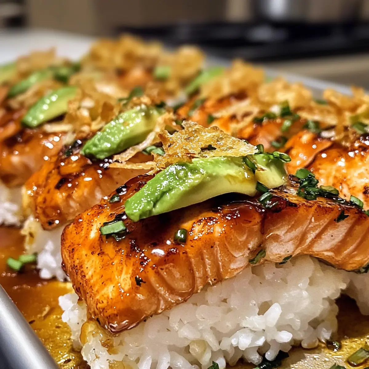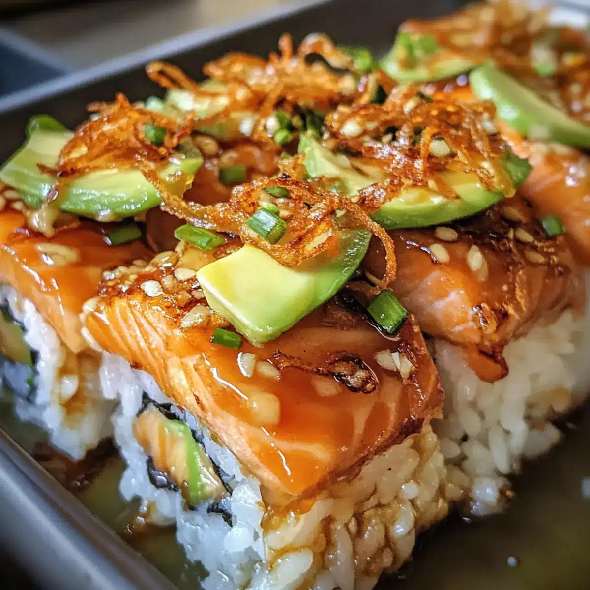 Gemütliche Atmosphäre: Ideal für romantische Abende oder gesellige Zusammenkünfte, dieser Teriyaki Lachs Sushi Auflauf macht jede Mahlzeit zu etwas Besonderem.