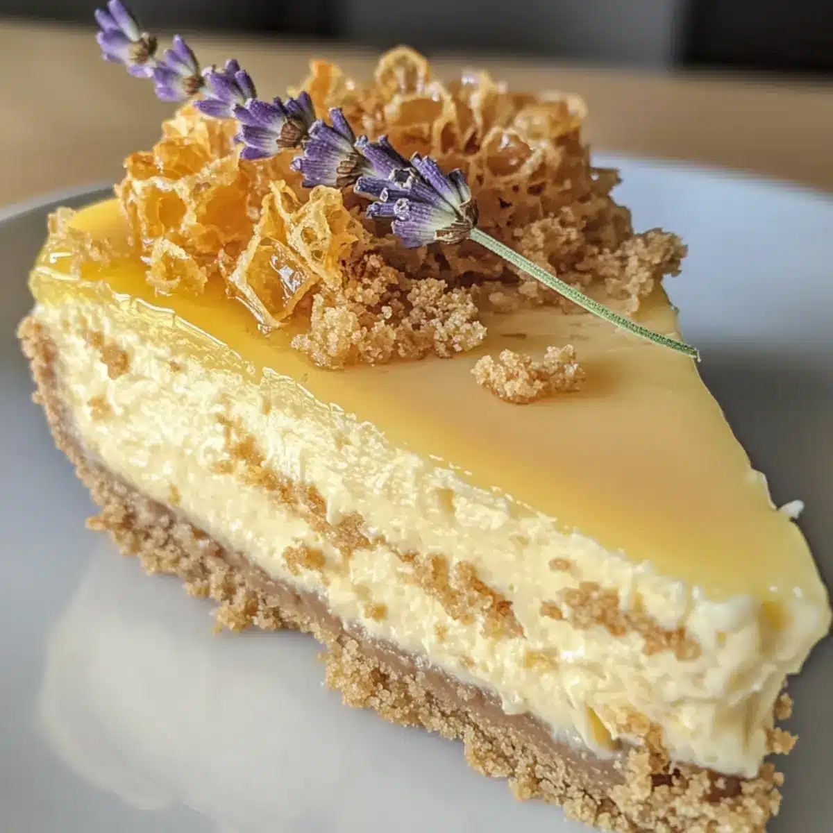 Vor dem Servieren legt ihr Stücke der frischen Honigwaben oben auf den Käsekuchen und träufelt nach Belieben etwas Honig darüber. Garnieren könnt ihr mit Lavendelblüten und zusätzlichem Zitronenzesten für einen frischen Farbkontrast. Der Zitronen-Lavendel-Käsekuchen ist nun bereit, präsentiert und genossen zu werden.